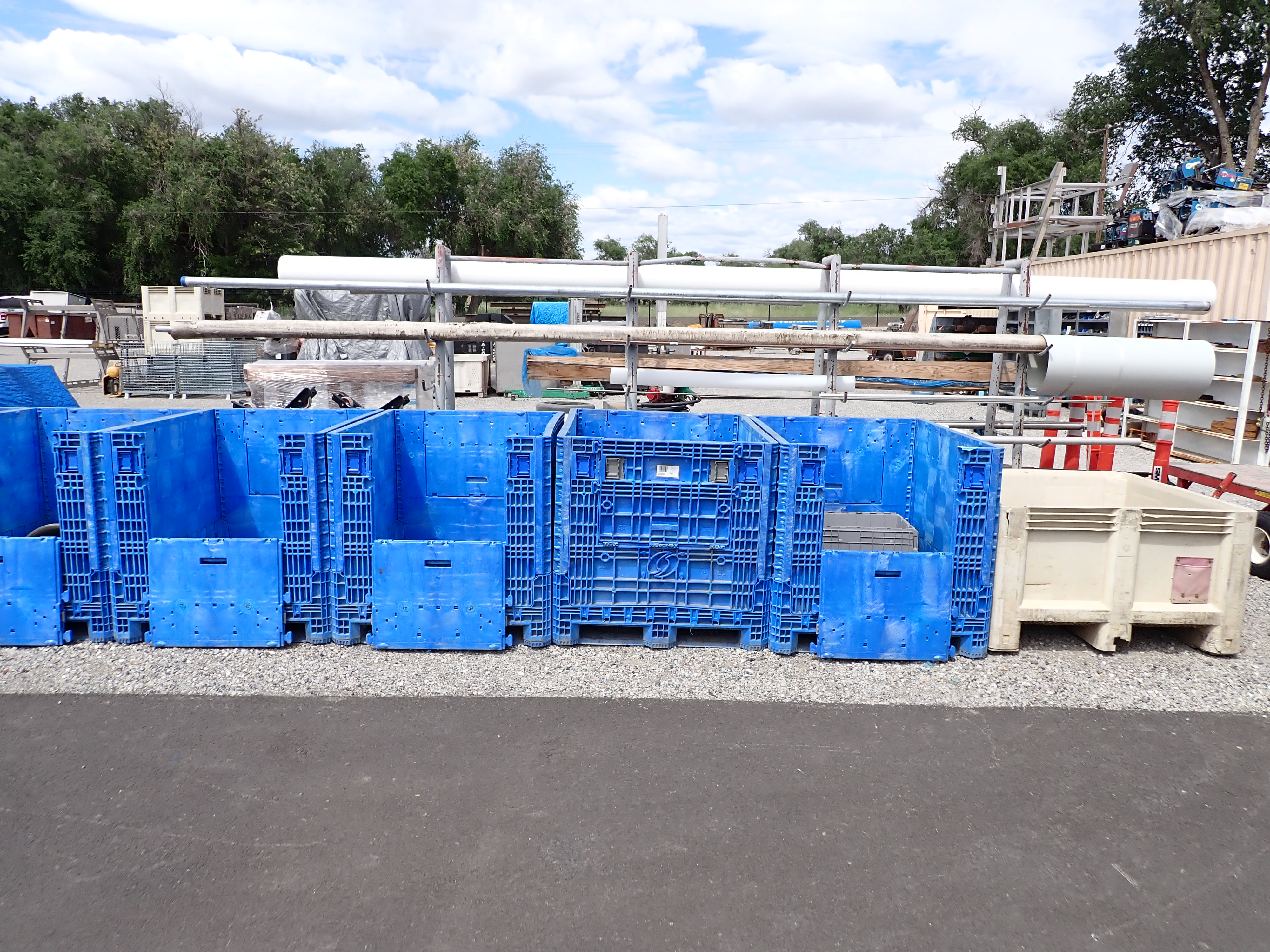 (7) ORBIS FOLDING BINS, PIPE RACK, CANTILEVER RACK, CART & MISC. JOBSITE SUPPLIES