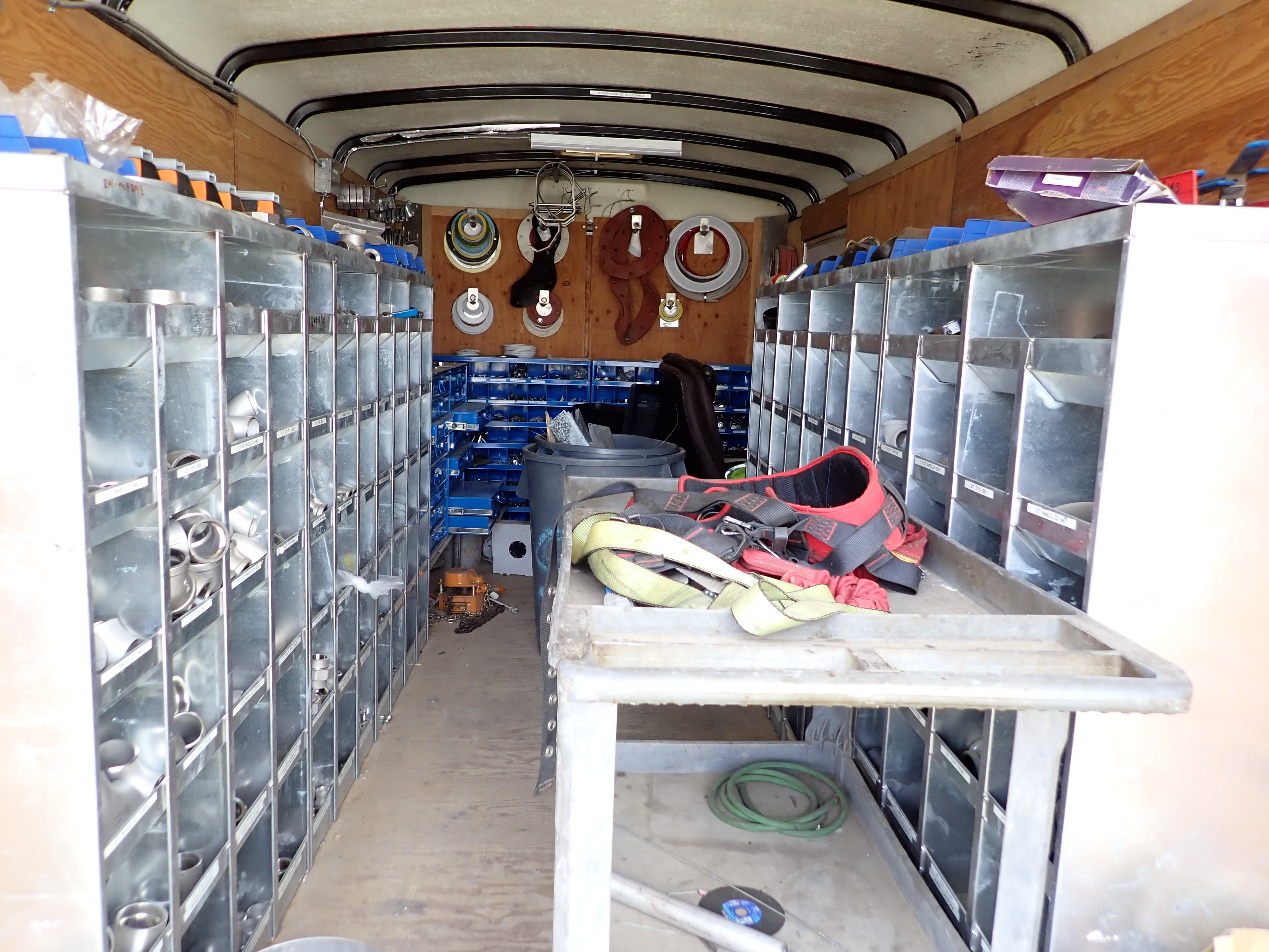 ASSORTED FITTINGS, ELBOWS, CLAMPS, HARDWARE & CHAIN HOIST IN TRAILER