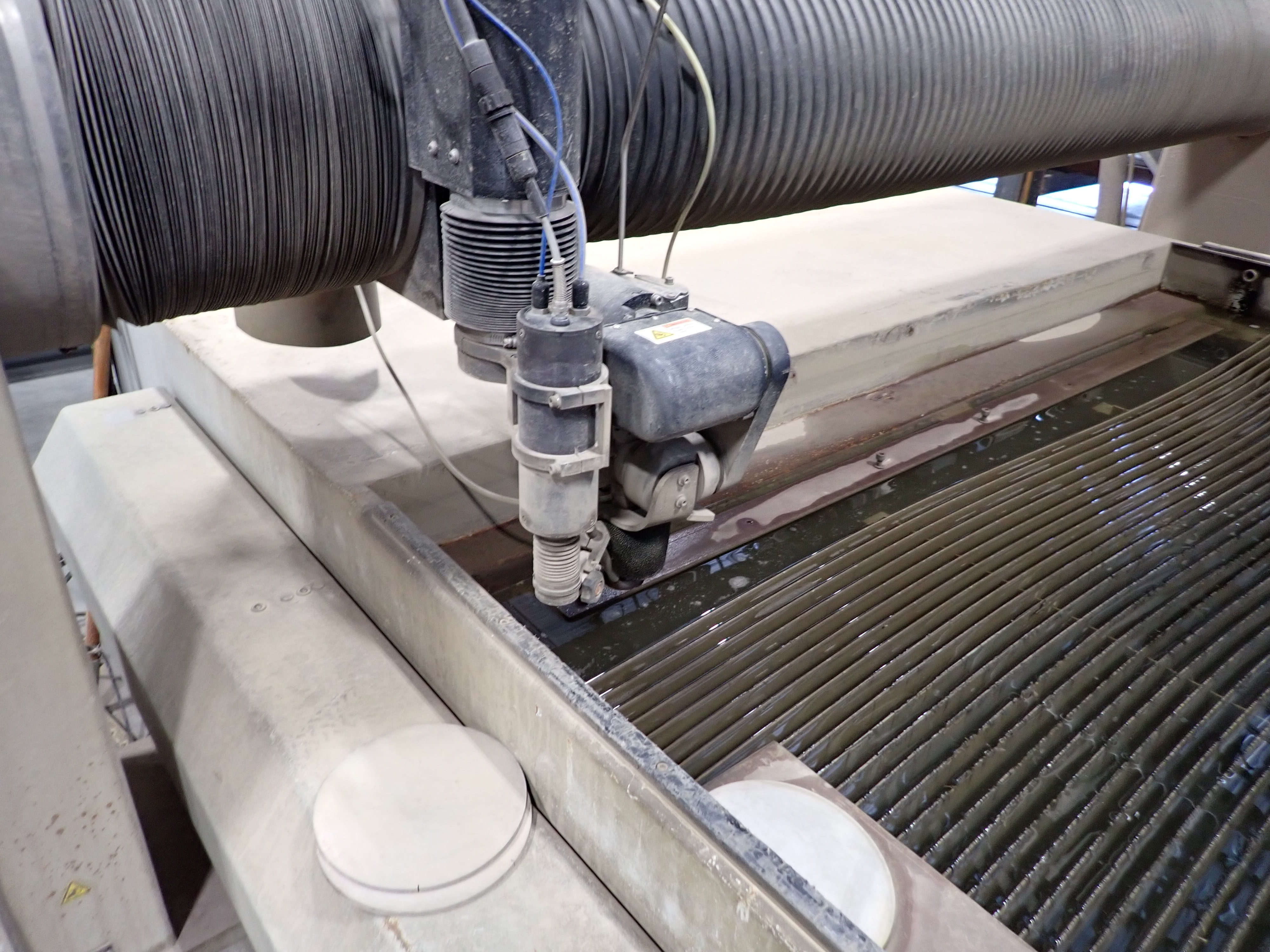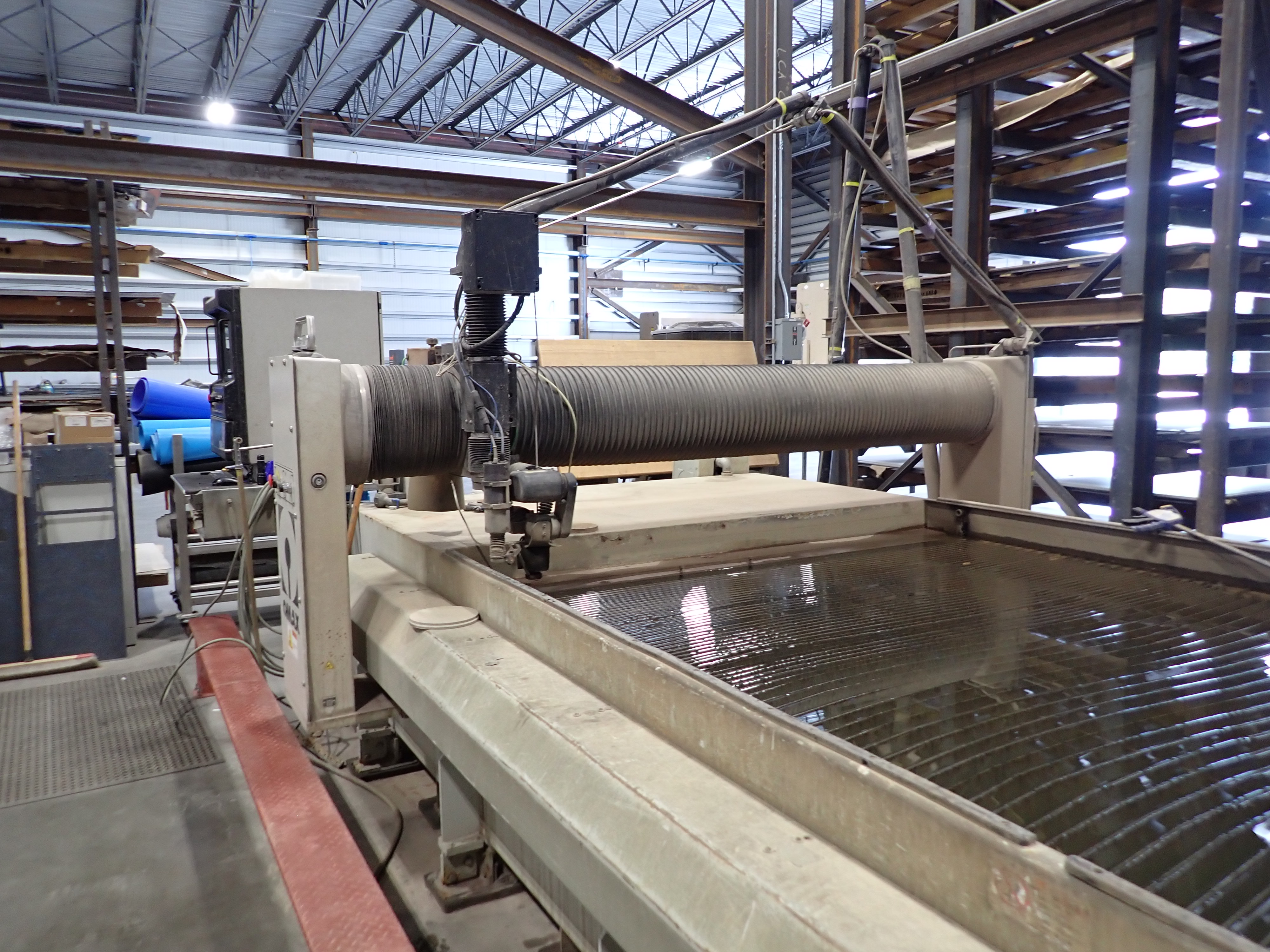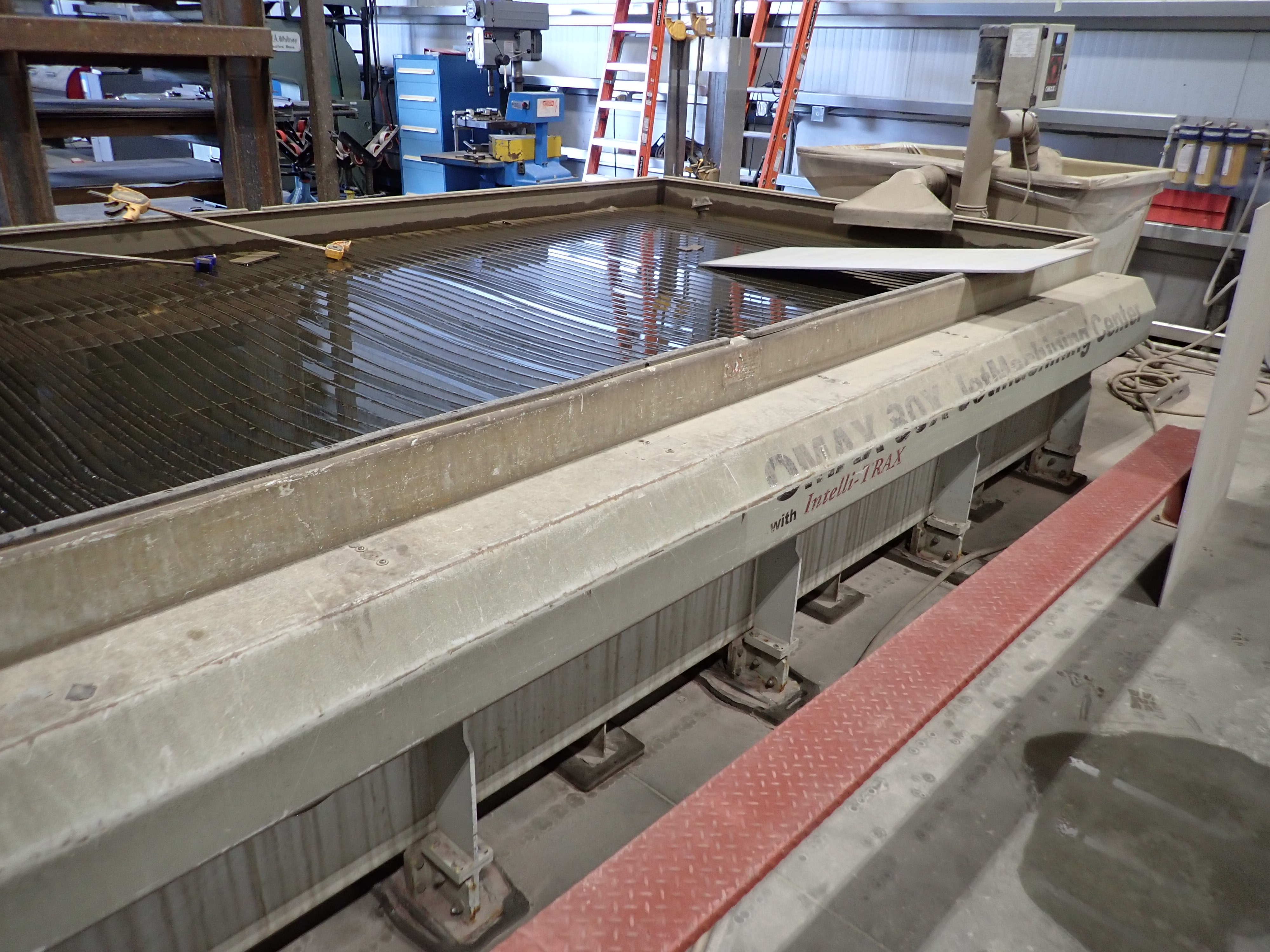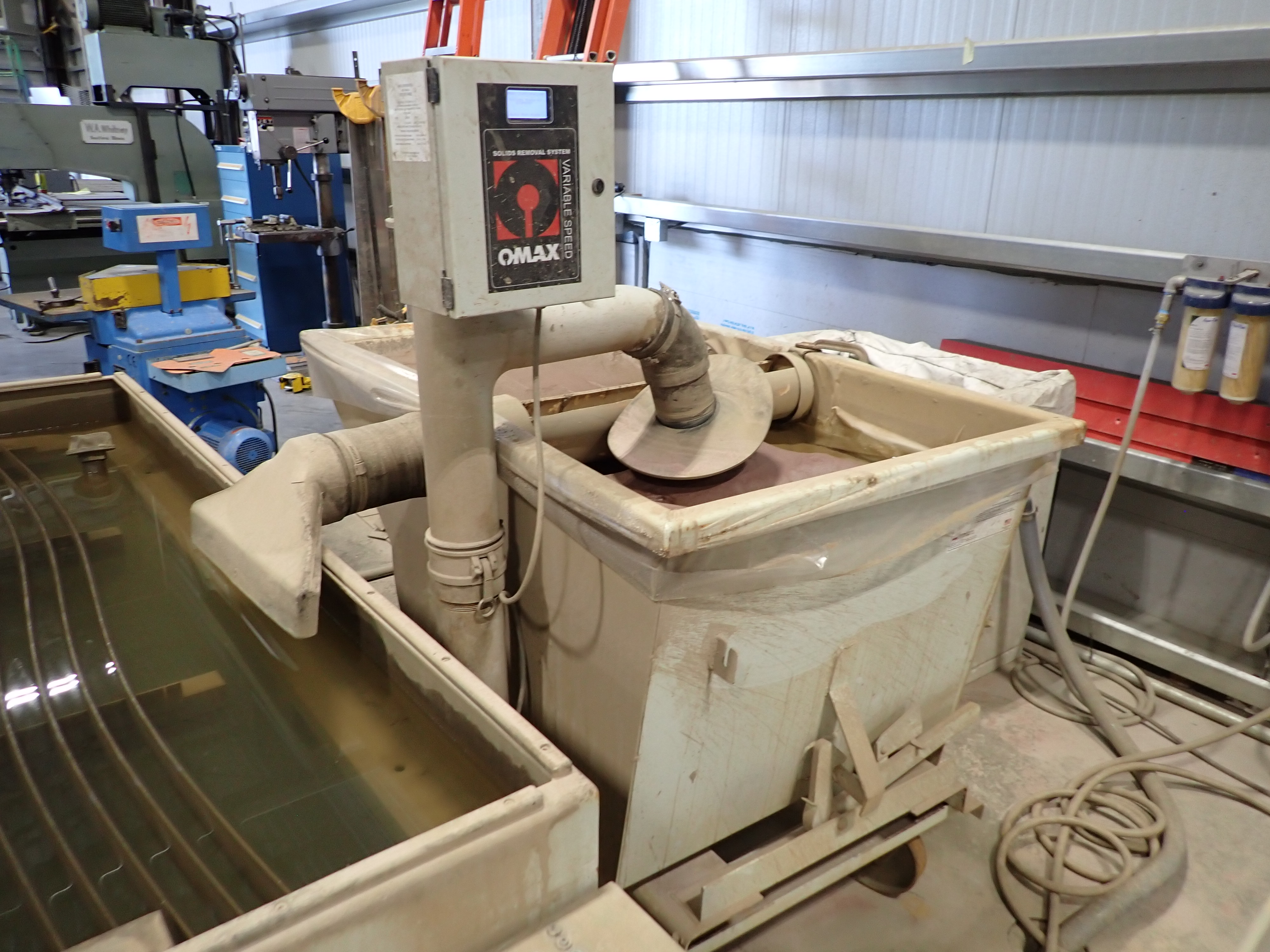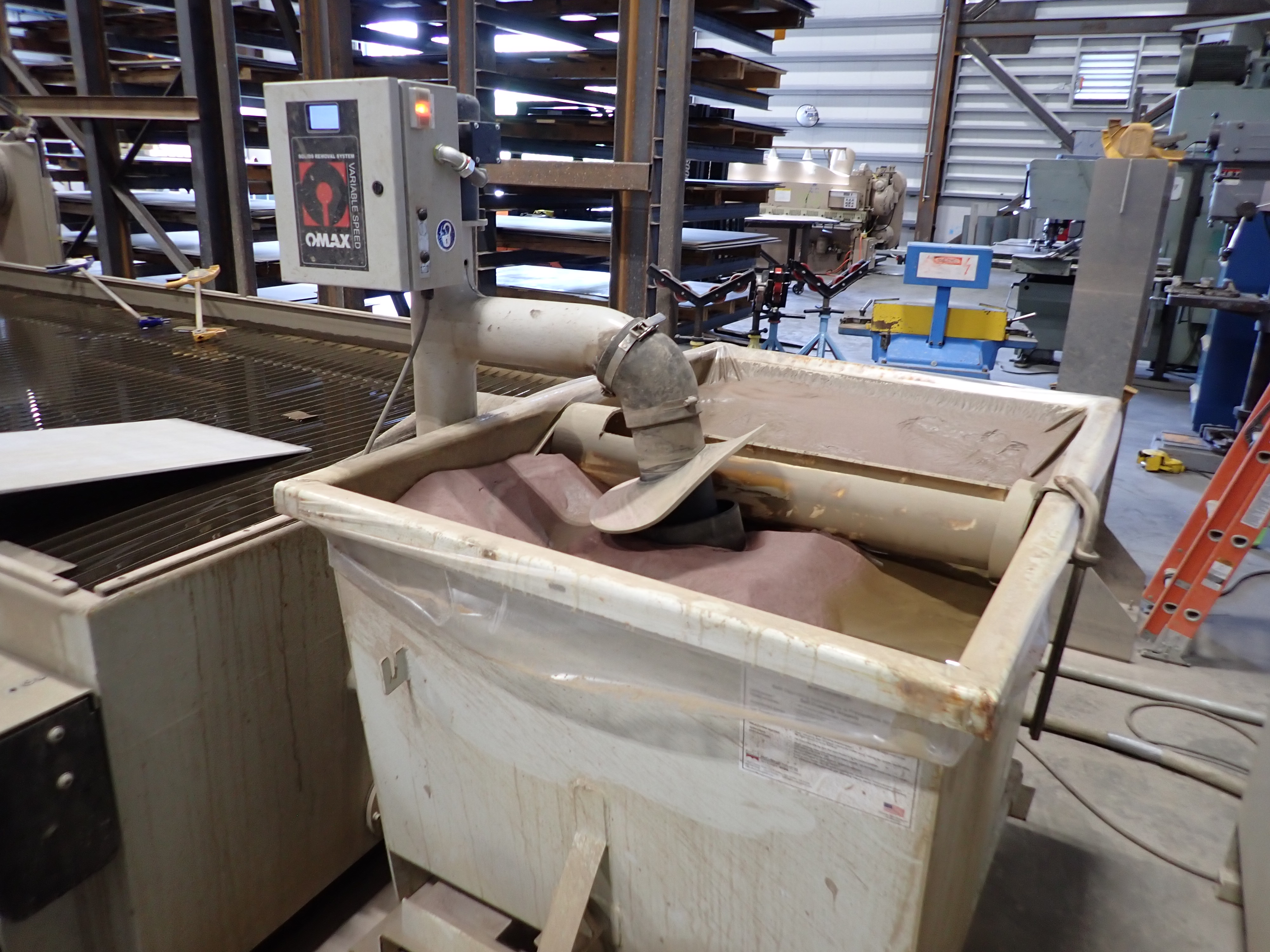CNC WATERJET, 7'X14' TABLE, P5060V PUMP, SOLIDS REMOVAL HOPPER, EBBCO FILTER BIN, CHILLER, 6,000 LB MEDIA HOPPER, CUSTOM BUILT HOPPER FILL STATION, CONTROLS