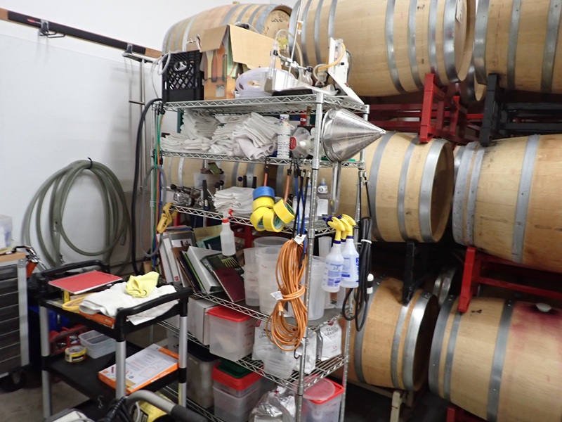 WIRE RACK W/VALVES, TESTERS, HOSES, CONTAINERS, CART & MISC. WINE MAKING SUPPLIES