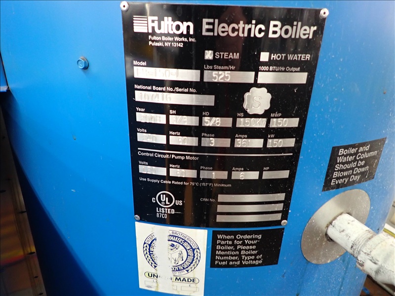 ELECTRIC STEAM BOILER, 525LBS/HR, 150KW, 240V, 3PH, S/N: 107416