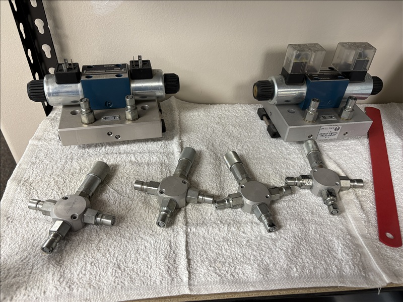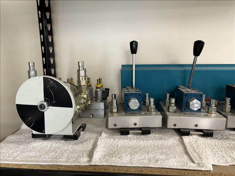 HYDRAULIC TRAINING PLATFORM WORK STATION SYSTEM ON CASTORS W/BOSCH WV12-RGC2 TEST STATION, AMPLIFIER MODULE, (2) PORTABLE HYDRAULIC POWER UNITS, ASSORTED VALVES, ACCESSORY PARTS & HOSE