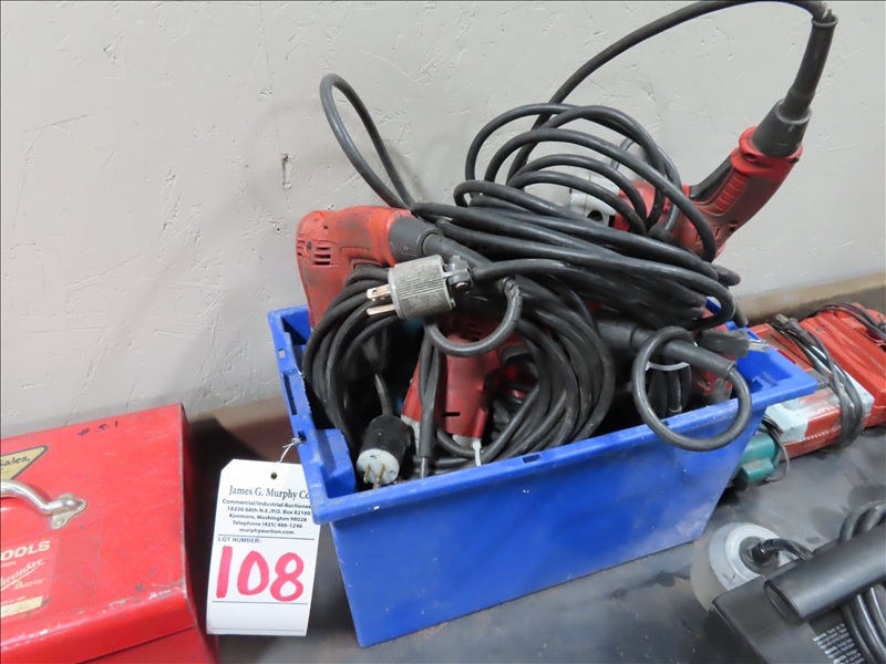 LOT, ASSORTED MILWAUKEE CORDED DRILLS & CHARGERS IN THIS BIN W/BIN
