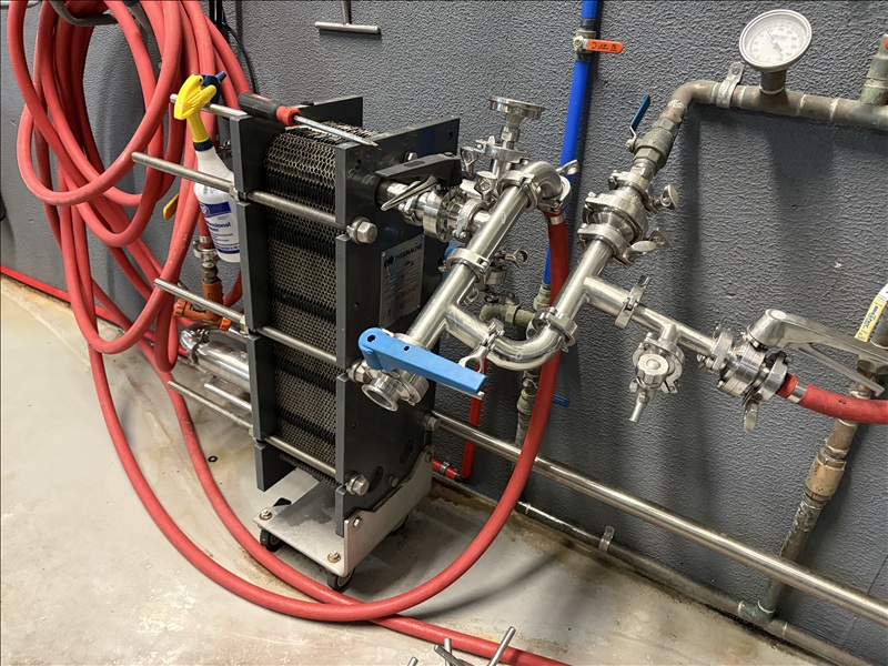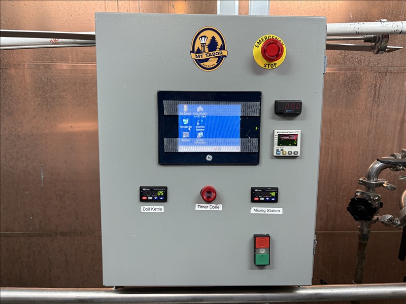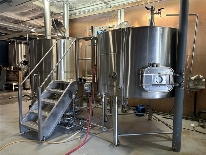 15-BARREL 2-VESSEL S.S. BREW HOUSE W/230V 3-PH JACKETED MASH MIXING STATION KETTLE, THERMALINE 15152-CS-51 HEAT EXCHANGER, GAS JACKETED BOIL KETTLE, LEESON SM4 INVERTER DRIVE, TOUCH SCREEN CONTROLS, COLD WATER OUTLET, PLATFORM