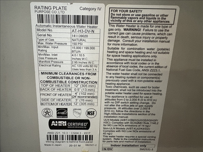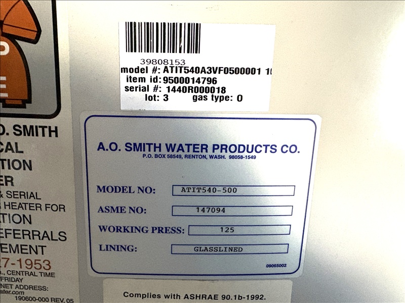 HOT WATER SYSTEM W/(3) ST-H3-DV-N ON DEMAND GAS HOT WATER HEATERS, & AT1T540-500 500-GALLON GLASSLINED HOT WATER RECEIVING TANK