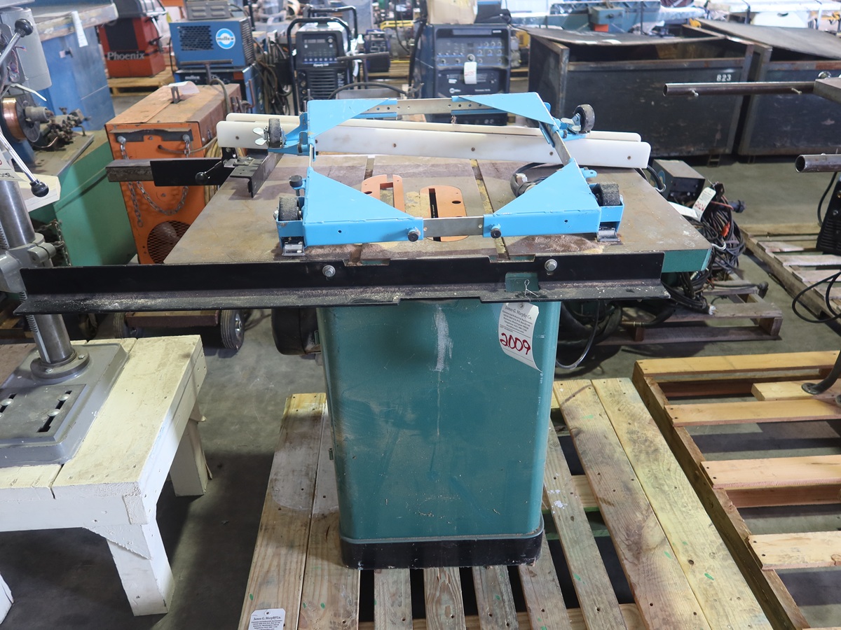 10" TABLE SAW, 40" X 27" TABLE, W/SHOP FOX FENCE & EQUIPMENT STAND ON CASTERS, 3 HP, 110V