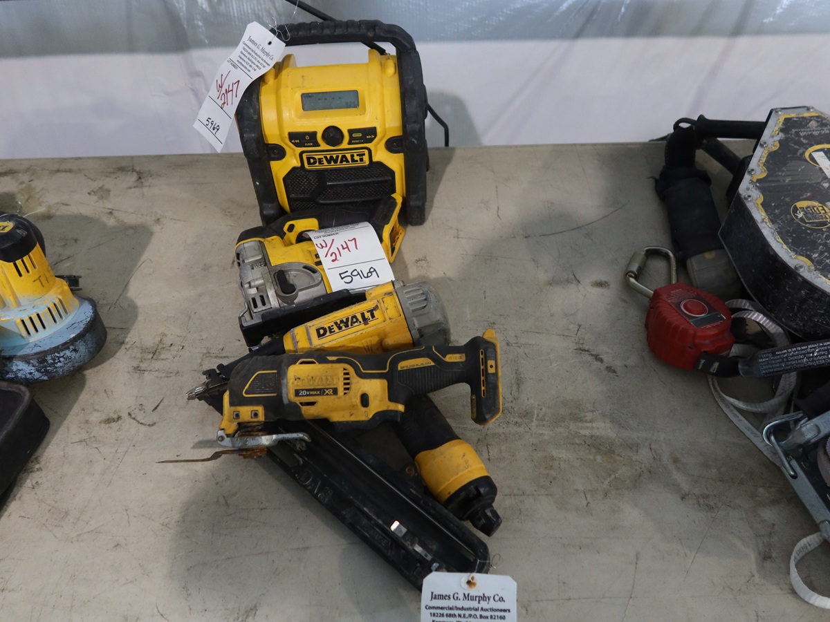 LOT, (4) ASSORTED DEWALT 20V CORDLESS TOOLS TO INCLUDE: NAIL GUN, JIGSAW, MULTI-TOOL & RADIO (NO BATTERY OR CHARGER)