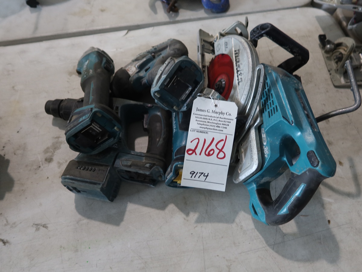 LOT, (5) ASSORTED MAKITA CORDLESS TOOLS TO INCLUDE: 36V CIRCULAR SAW, 1/2" IMPACT DRIVE, GRINDER, MULTI-TOOL & ROTO HAMMER, 18V (NO BATTERIES OR CHARGERS)
