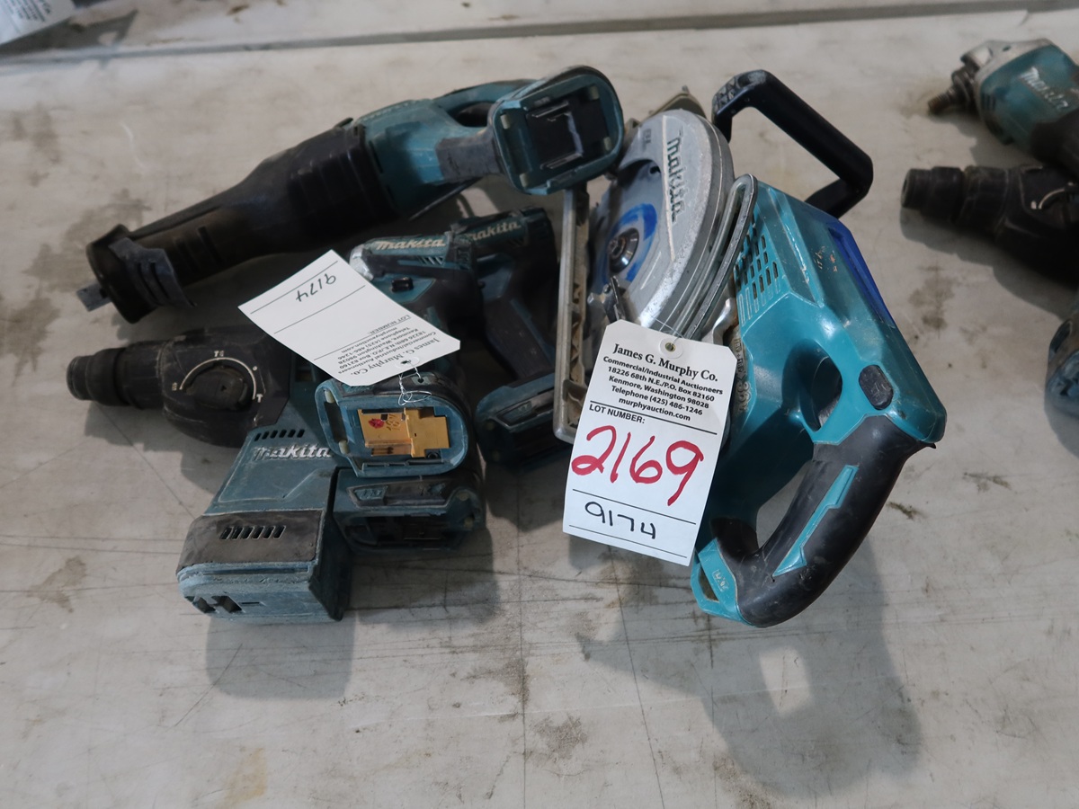 LOT, (5) ASSORTED MAKITA CORDLESS TOOLS TO INCLUDE: 36V CIRCULAR SAW, SAWZALL, 1/2" DRILL, 1/4" IMPACT DRIVER & ROTO HAMMER, 18V (NO BATTERIES OR CHARGERS)