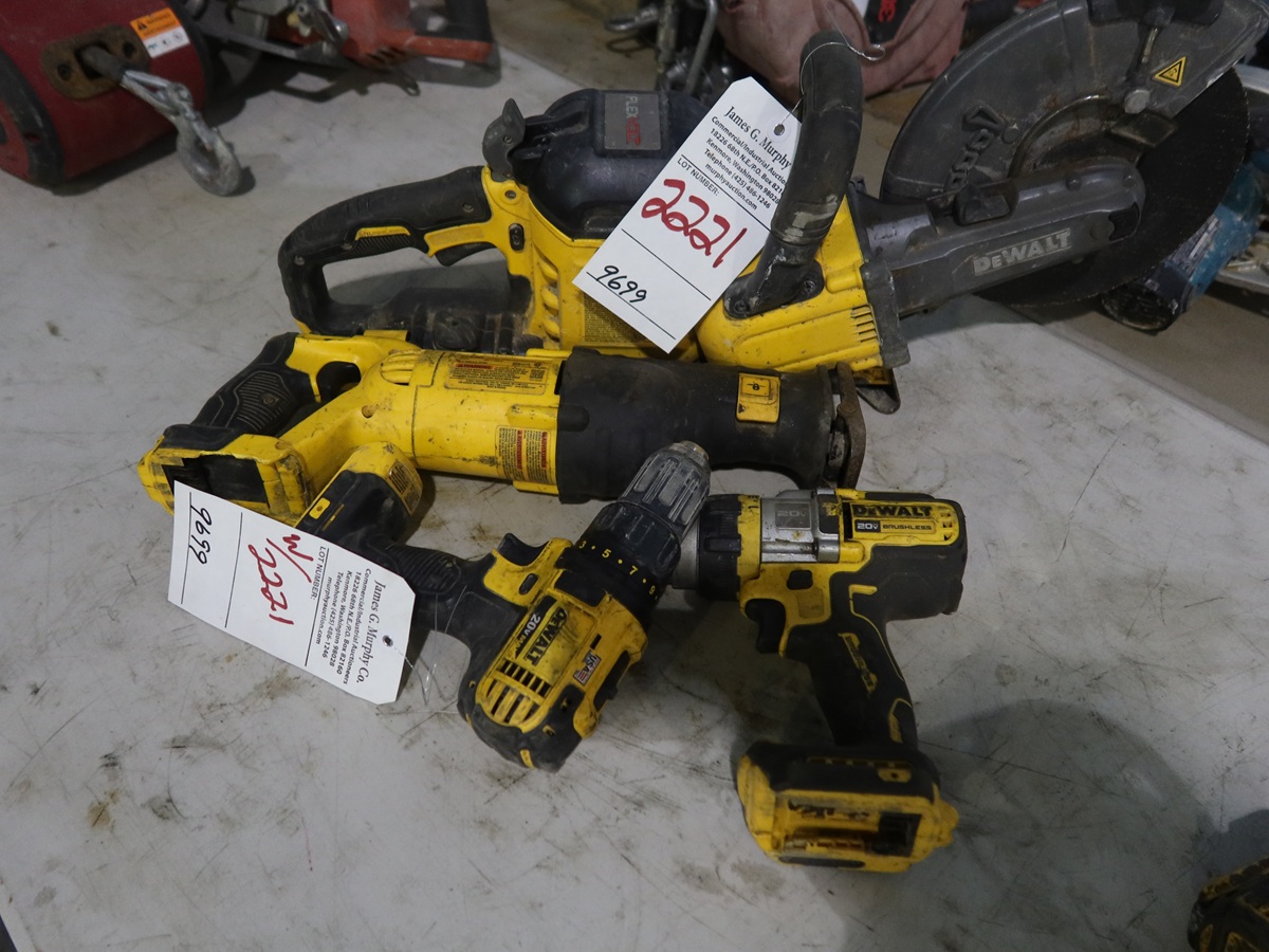 LOT, ASSORTED DEWALT CORDLESS TOOLS TO INCLUDE: CUT-OFF SAW, RECIPROCATING SAW & (2) 1/2" DRILLS (NO BATTERIES OR CHARGERS)