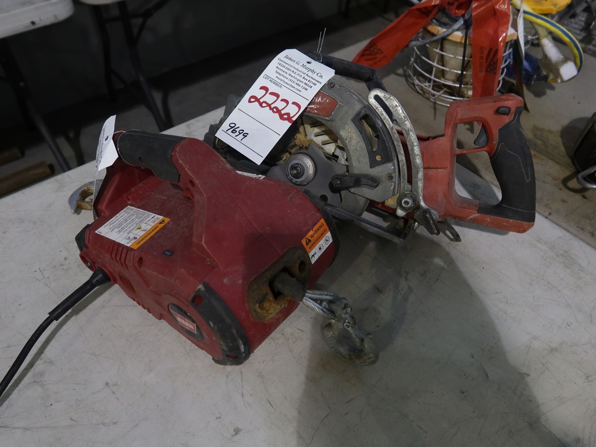 7-1/4" REAR HANDLE CIRCULAR SAW, 18V (NO BATTERY OR CHARGER) & WARN HANDHELD ELECTRIC WINCH, 115V (NEEDS REPAIR)