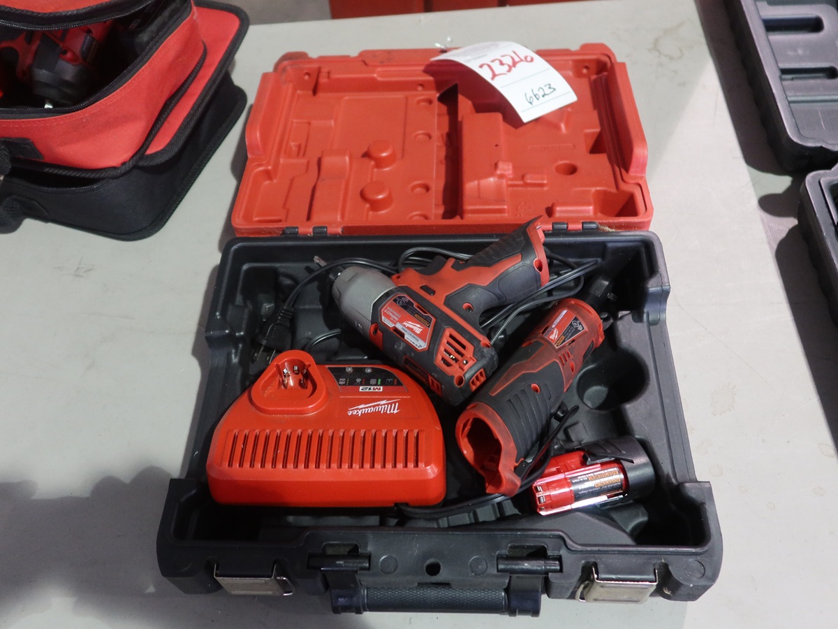 LOT, MILWAUKEE 2456-20 1/4" SQUARE DRIVE RATCHET, MILWAUKEE 2462-20 1/4" HEX IMPACT DRIVER, 12V CORDLESS TOOLS W/BATTERY & CHARGER