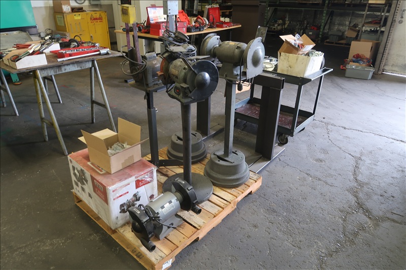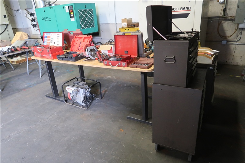 MISC. TOOLS TO INCLUDE MILWAUKEE & ROCKWELL MAG DRILLS, MILWAUKEE COMPOUND MITER SAW, ENERPAC PORTA POWERS, ABRASIVE SAW, MILWAUKEE RECHARGEABLE TOOLS, ROLLING TOOLBOXES, NUMEROUS POWER TOOLS, PULLER SET, TABLETOP & STAND MOUNT GRINDERS, (3) PALLET JACKS