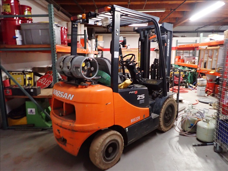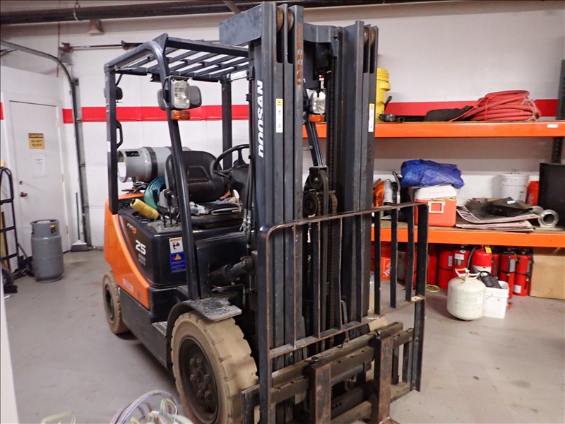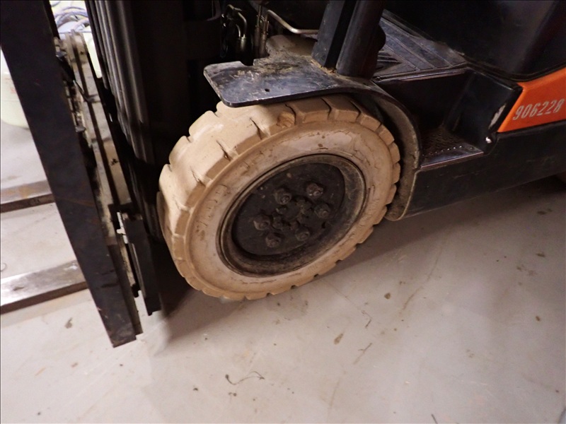 4,600 LB CAP. CUSHION TIRED FORKLIFT, 186" 3-STAGE MAST, SIDE SHIFT, DUAL FUEL, S/N: KGA0B-1330-02244, HRS: 1,200