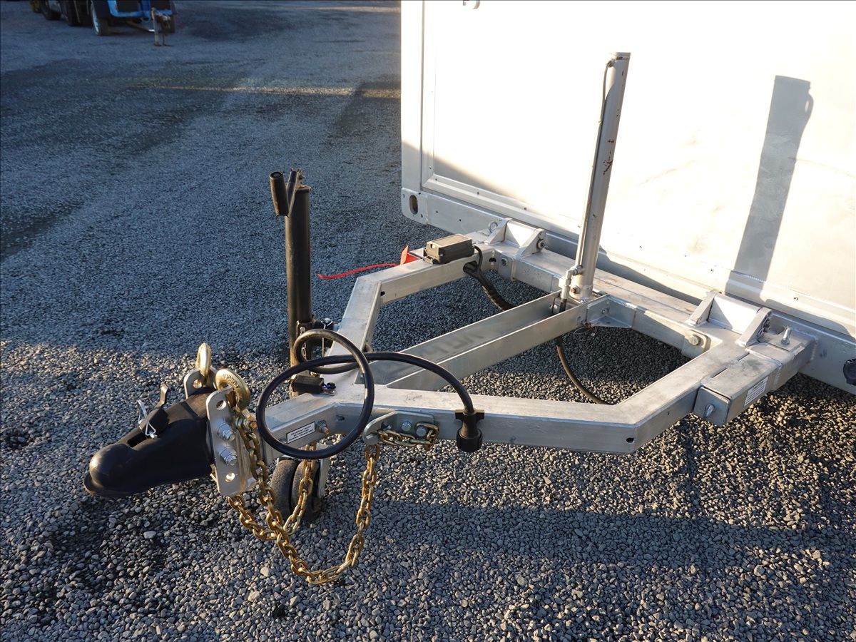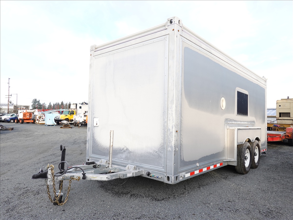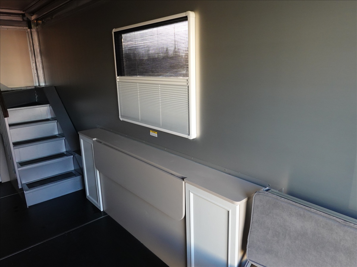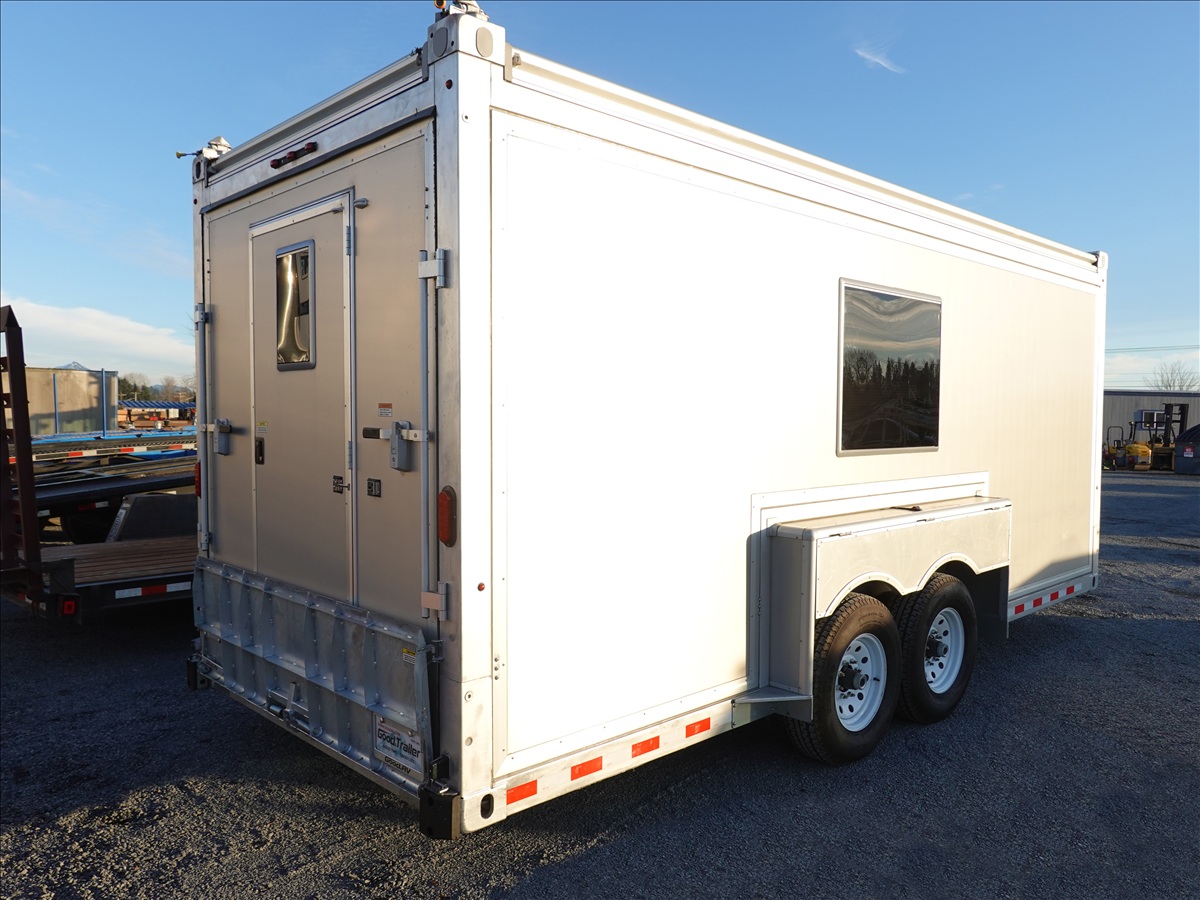 T/A, 19' X 7'2" 11,800 LB GVWR HYDRAULIC DROP DECK ENCLOSED TRAILER, SINK, STAIRS TO ROOF HATCH, FOLDING SEATS, SIDE WINDOWS, END DOOR, SELF CONTAINED HYDRAULIC POWER BOX, 235/80R16