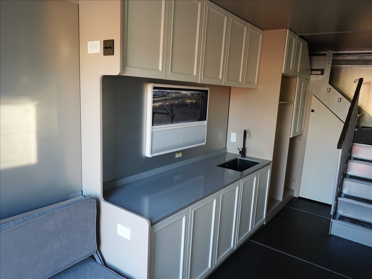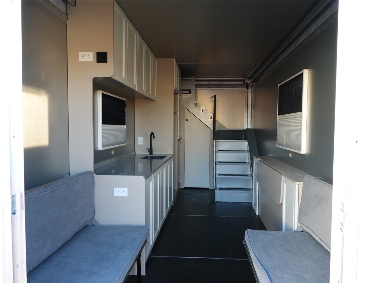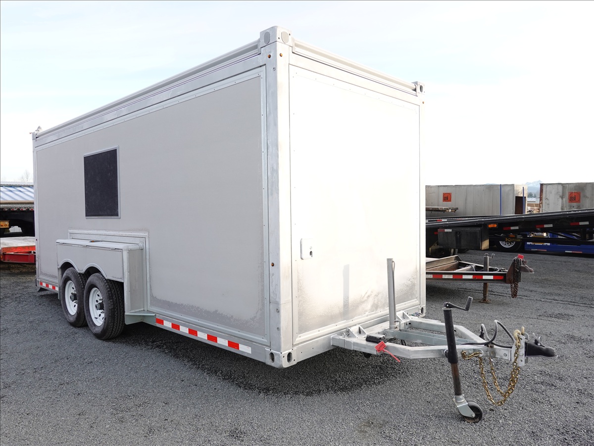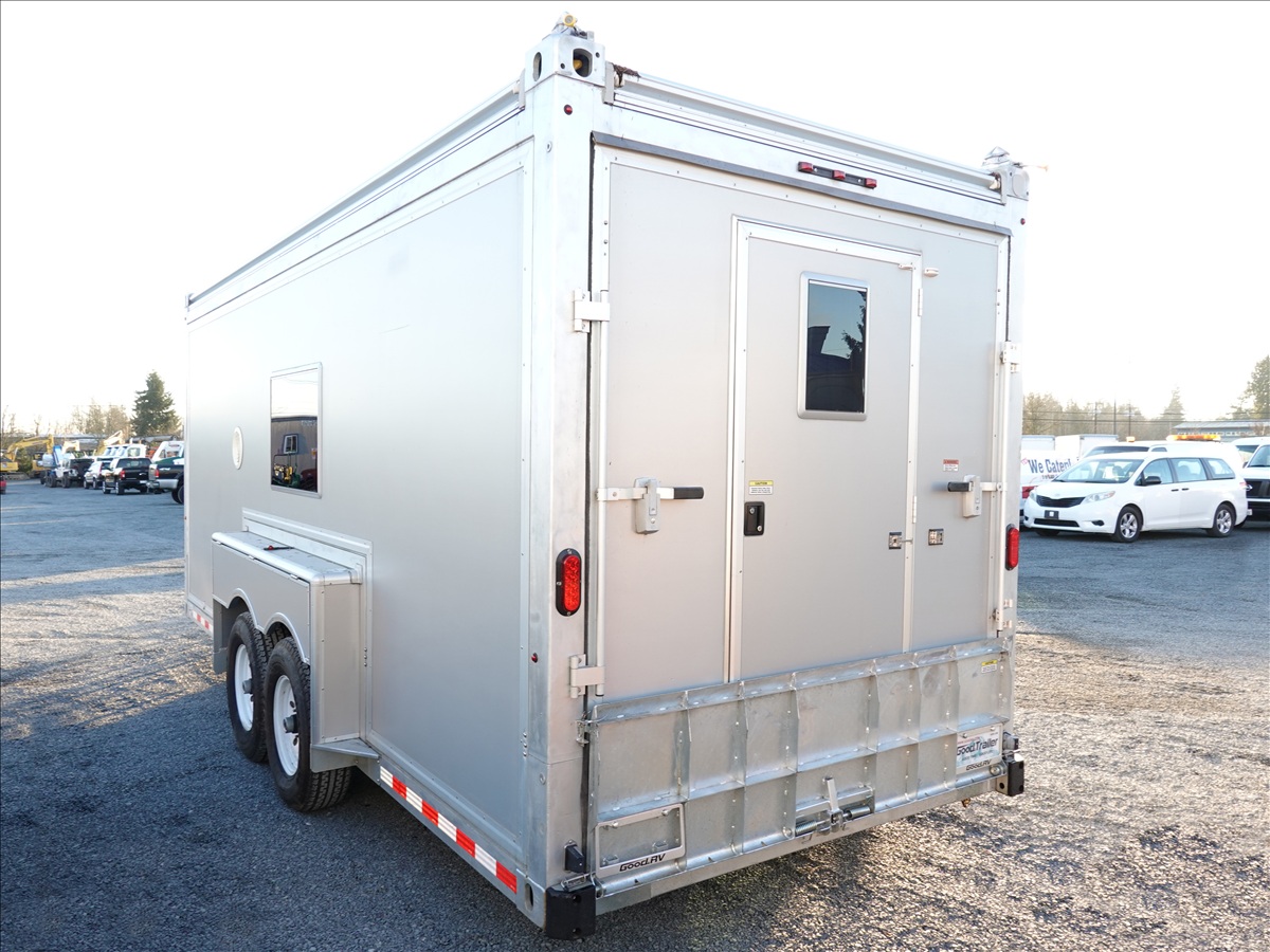 T/A, 19' X 7'2" 11,800 LB GVWR HYDRAULIC DROP DECK ENCLOSED TRAILER, SINK, STAIRS TO ROOF HATCH, FOLDING SEATS, SIDE WINDOWS, END DOOR, SELF CONTAINED HYDRAULIC POWER BOX, 235/80R16