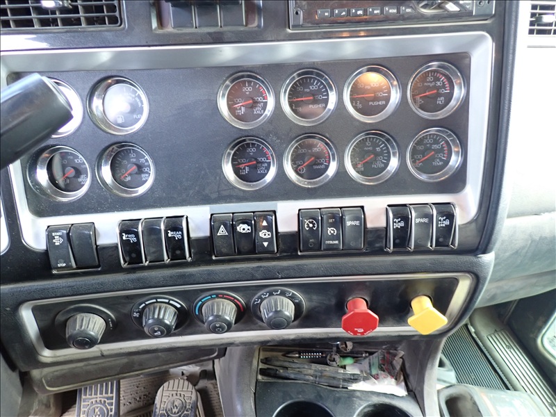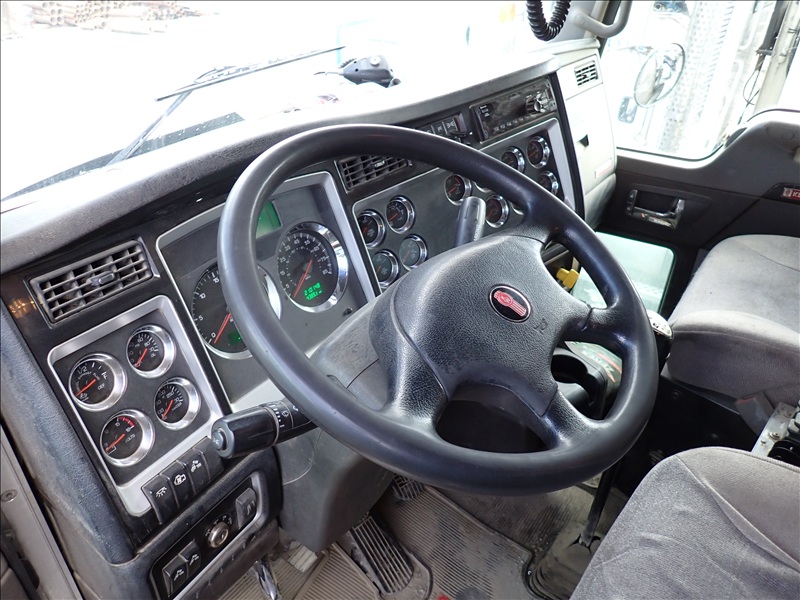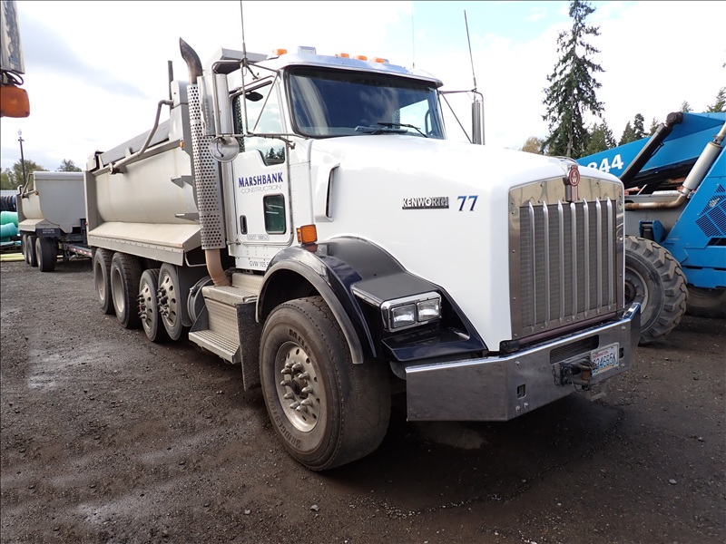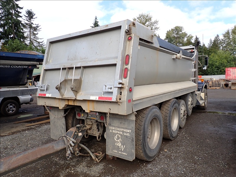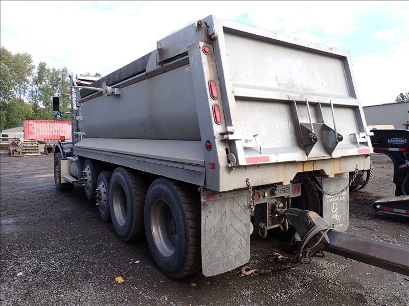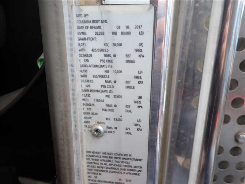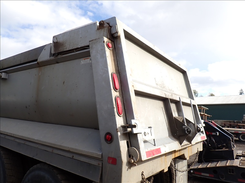 QUAD/A DUMP TRUCK, PACCAR MX13-510HP, RTL018918B-18 SPD, D46-170H-46,000 REARS W/4.10 RATIO, LOCKER, HAULMAX SUSPENSION, 20,000 FRONT, (2) 10,000 DROP AXLES, COLUMBIA 18' STEEL BOX W/HIGH LIFT GATE, AUTO TARP SYSTEM, MATERIAL CHUTE, PLUMBED FOR PUP