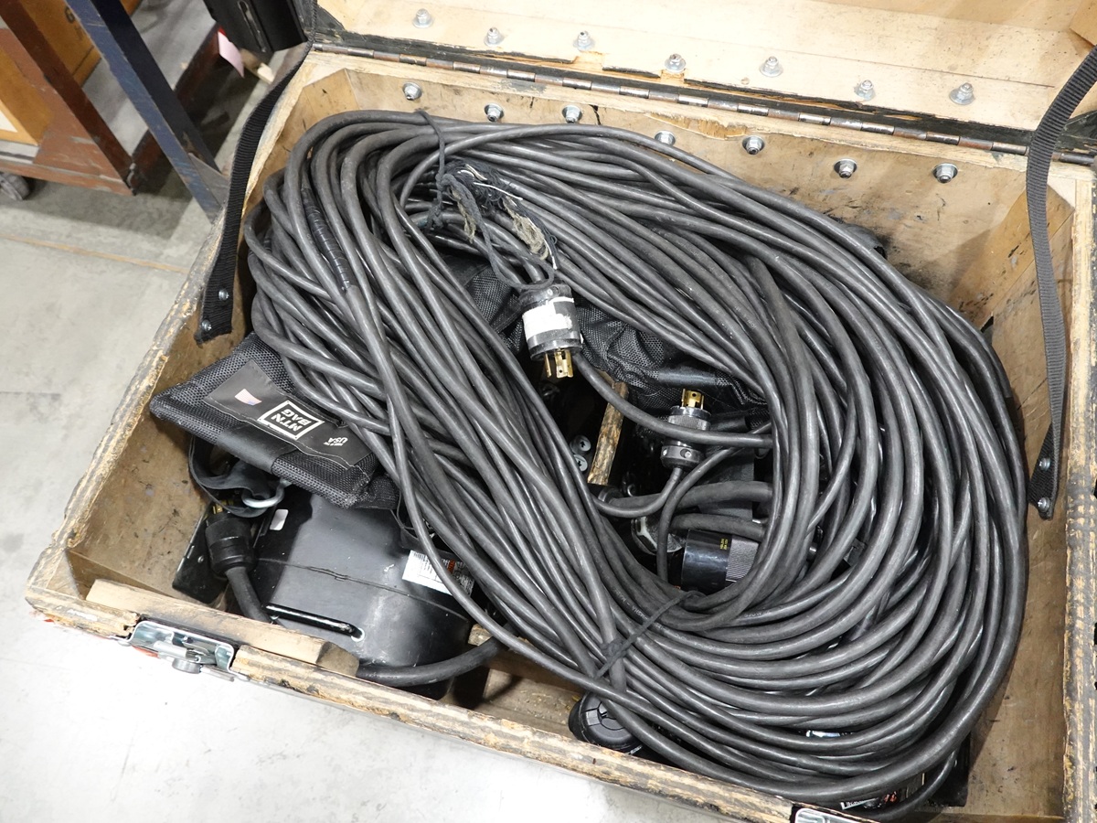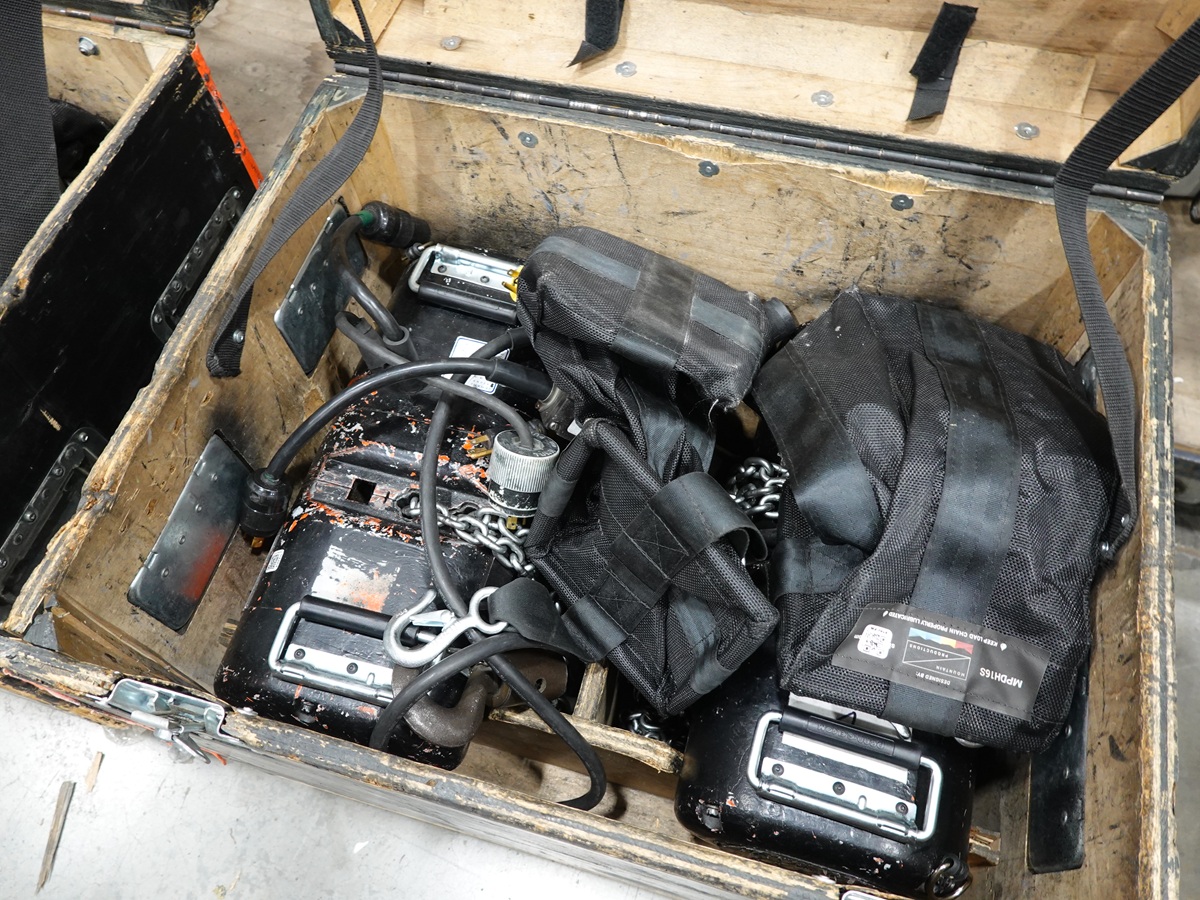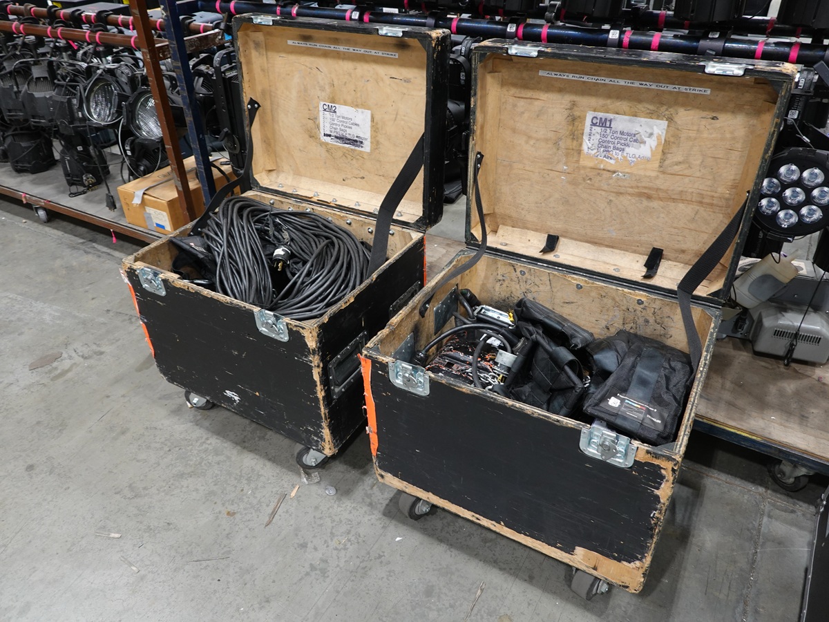 (2) HOIST SETS TO INCLUDE: (2) 1/2 TON MOTORS, (2) 150' CONTROL PANELS, (2) CHAIN BAGS, ADAPTER, ROAD CASE ON CASTERS