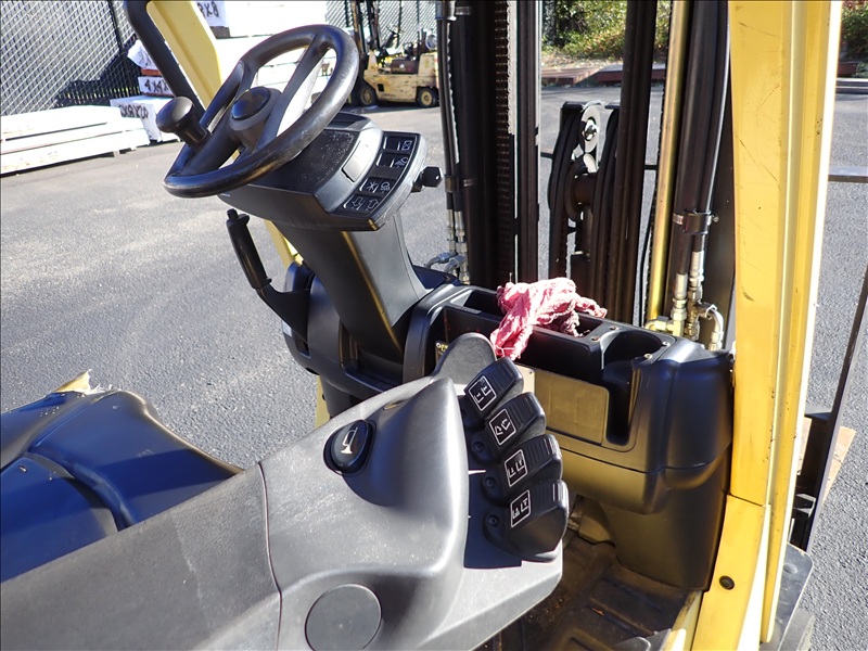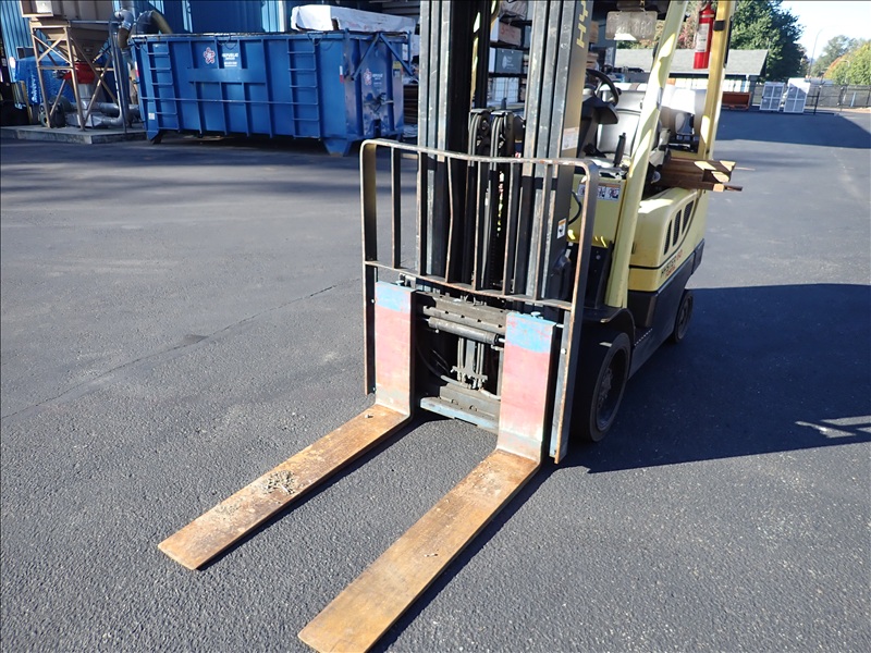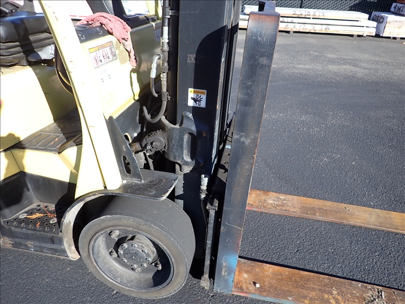 5,950LB CAP. SOLID TIRED FORKLIFT, 187" 3-STAGE MAST, AUX. HYDRAULICS, LUMBER FORKS, SIDE SHIFT, FINGER CONTROLS, PROPANE, S/N: F187V17511J, HRS: 8,800