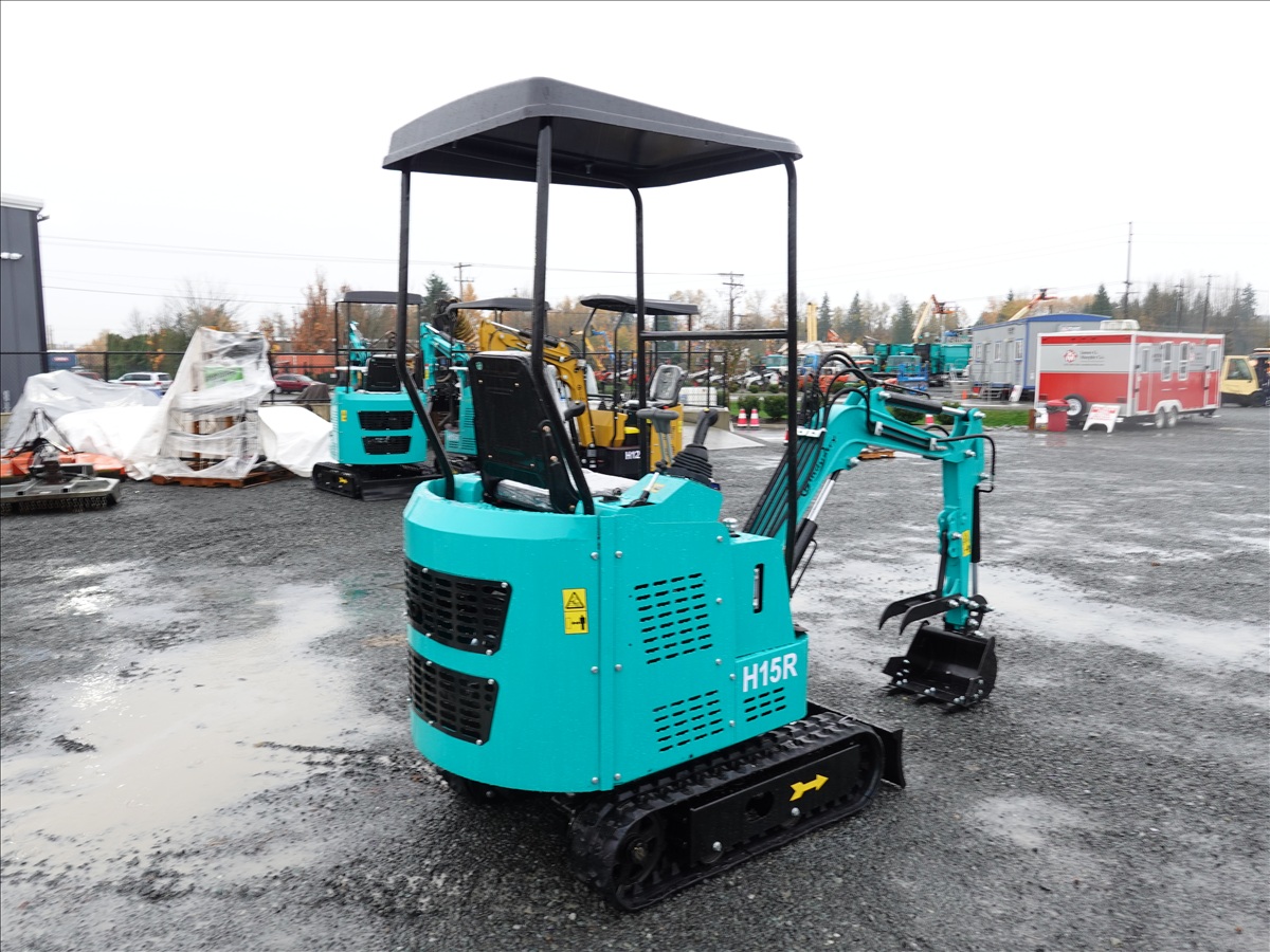 MINI EXCAVATOR, RATO 15 1 CYL GAS, 14" BUCKET, THUMB, BLADE, RUBBER TRACKS, CANOPY