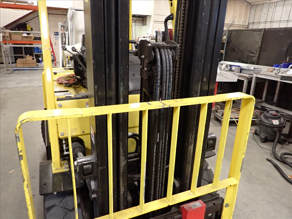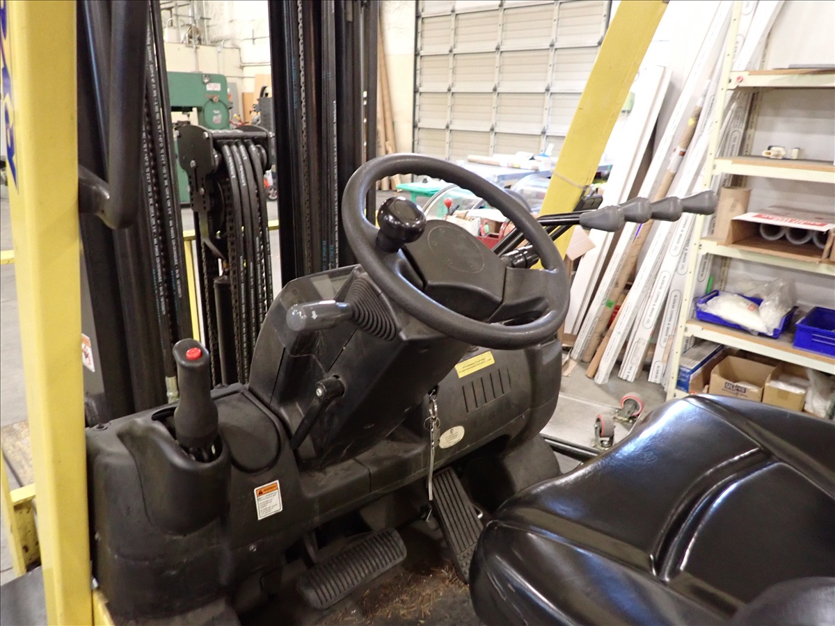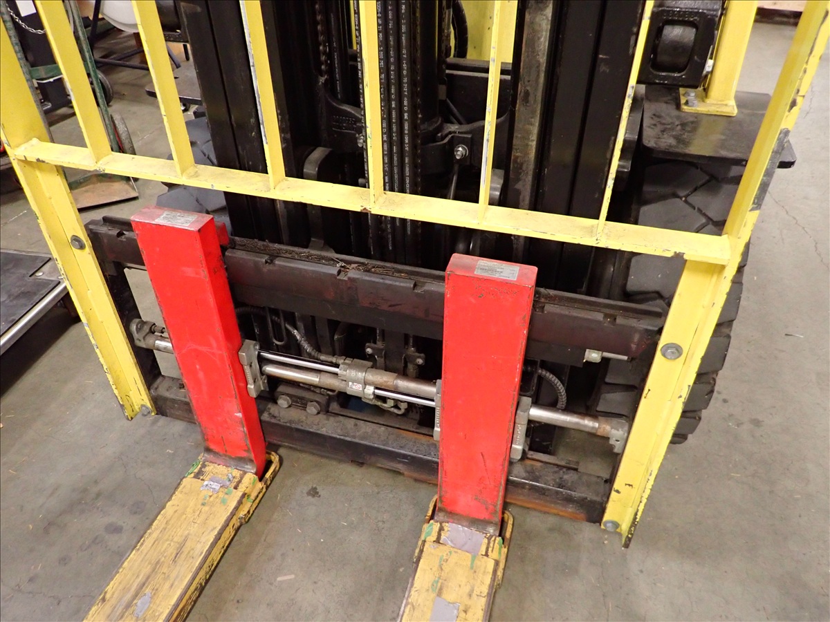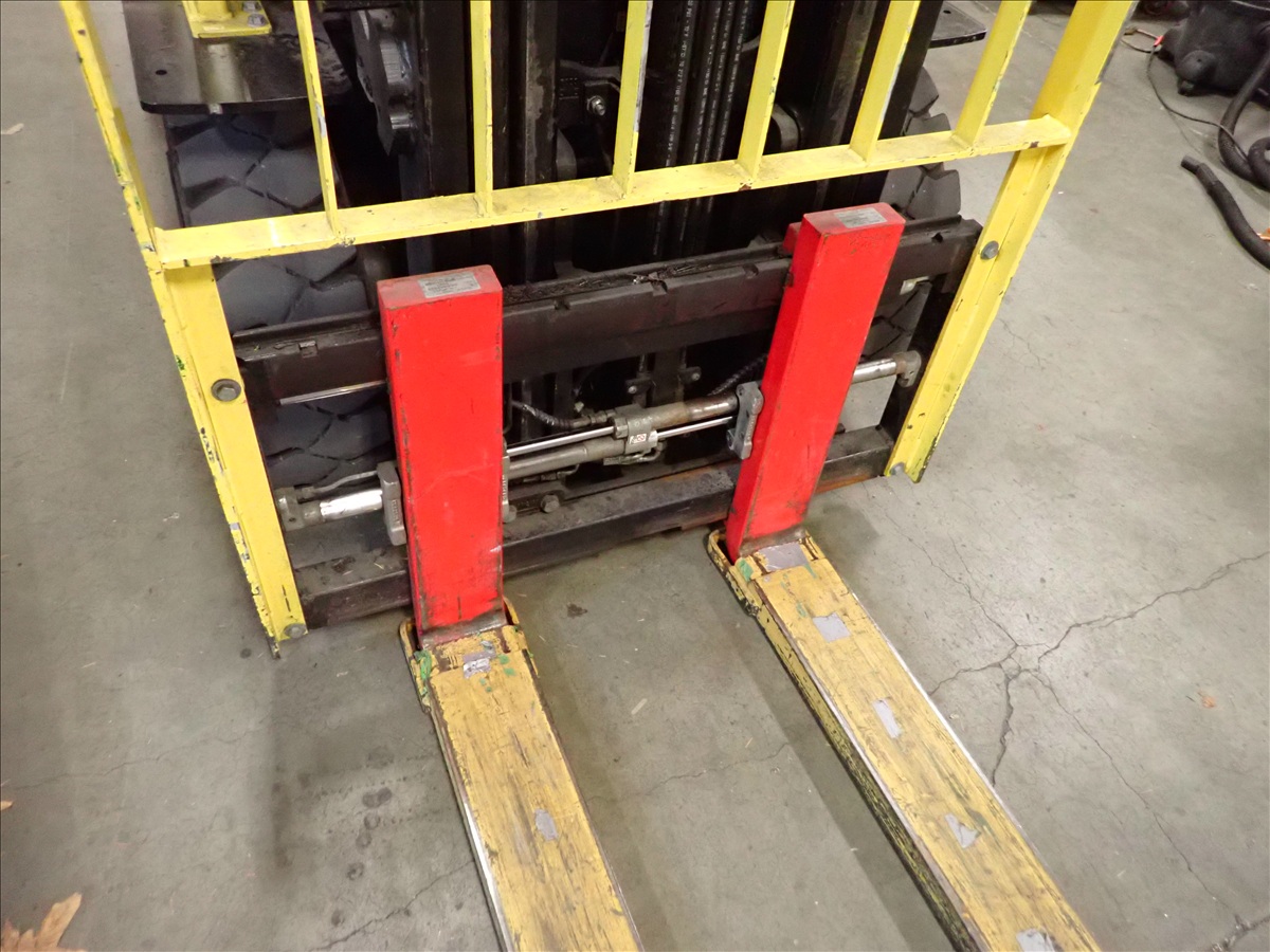 5,700 LB CAP. CUSHION TIRED FORKLIFT, 188" 3-STAGE MAST, FORK POSITIONERS, SIDE SHIFT, PROPANE, S/N: A380V10858V, HRS: 1,010