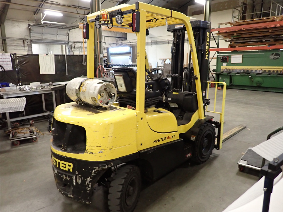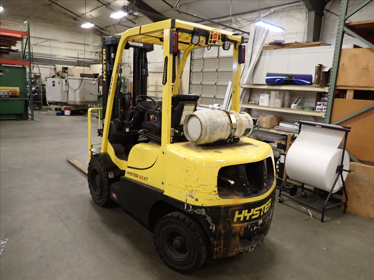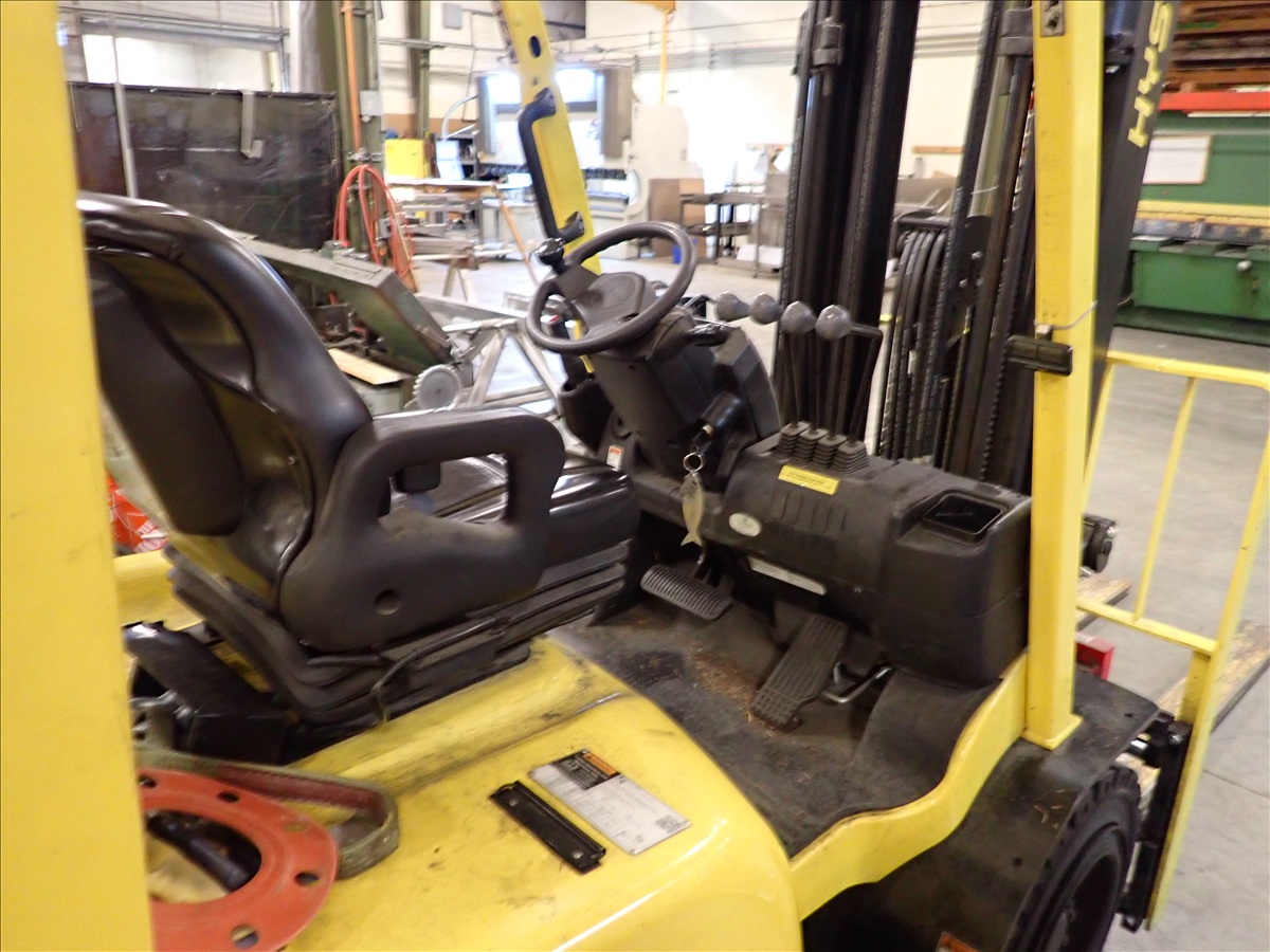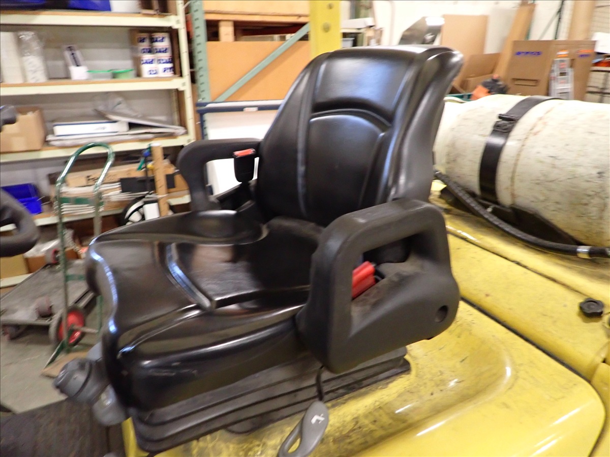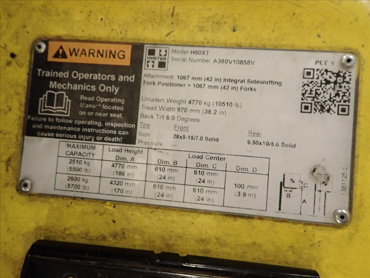 5,700 LB CAP. CUSHION TIRED FORKLIFT, 188" 3-STAGE MAST, FORK POSITIONERS, SIDE SHIFT, PROPANE, S/N: A380V10858V, HRS: 1,010