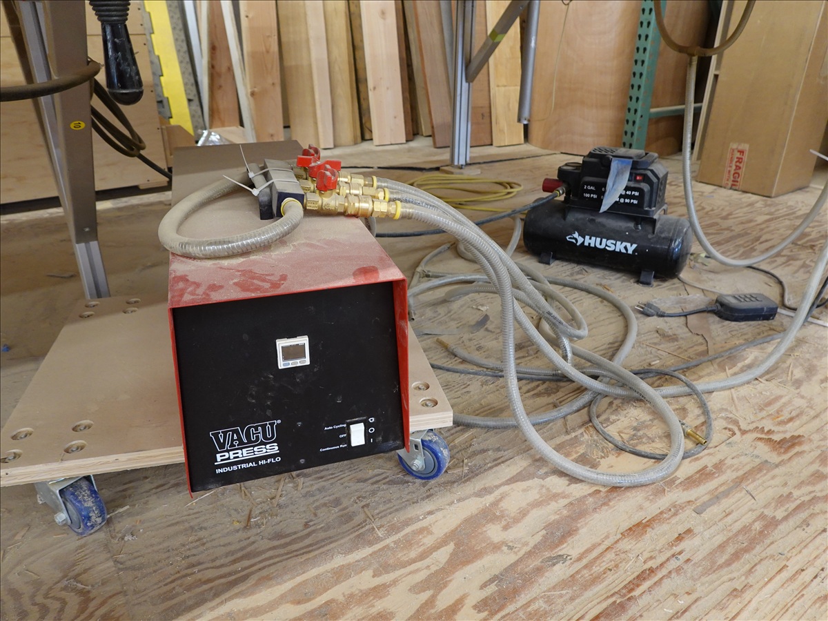 67"X127" VACUUM TABLE W/HUSKY 2-GAL AIR COMPRESSOR & HI-FLO INDUSTRIAL VACUPRESS PUMP