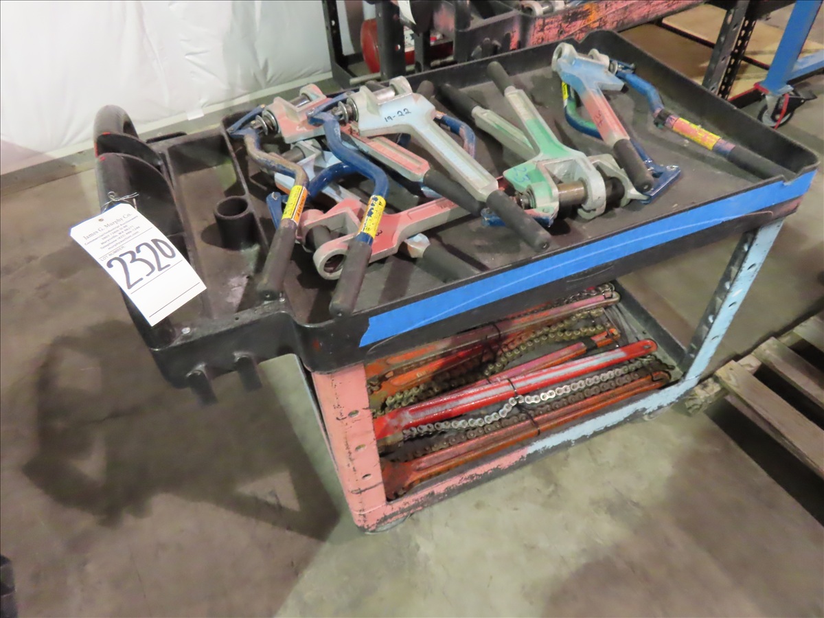 LOT, ASSORTED HOLE DRIVERS & CHAIN WRENCHES ON THIS CART W/CART
