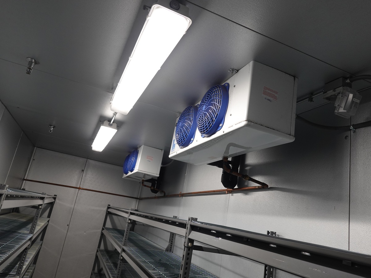 APPROX 17'X8'X8' WALK-IN COOLER W/(2) LARKIN 2-FAN CONDENSING UNITS, (2) ROWS 15' METAL SHELVING, DOOR & LIGHTS (DOESN'T INCLUDE COMPRESSOR)