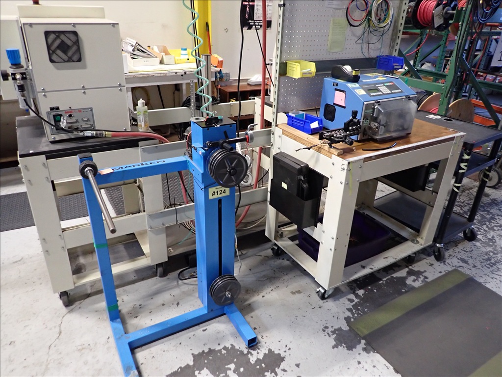 AUTOMATIC WIRE MEASURE, CUT & STRIP MACHINE W/MARKEN PREFEEDER, BENCH & ACCESSORIES