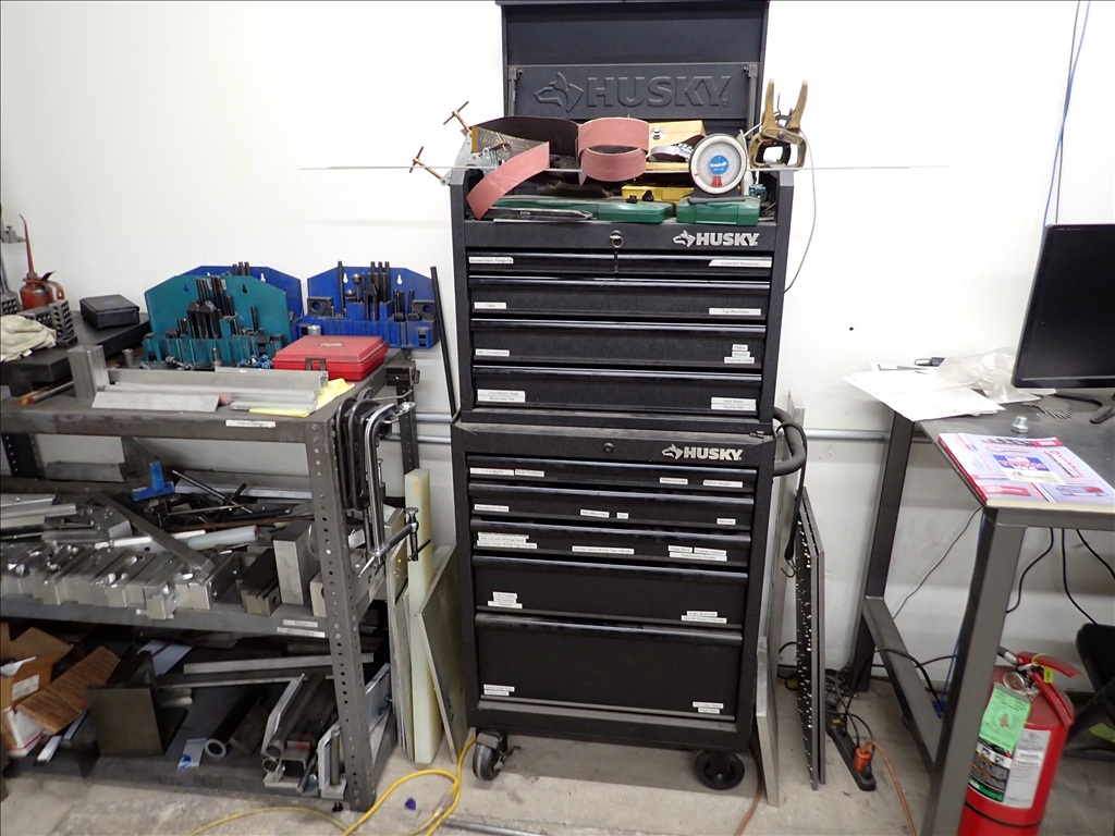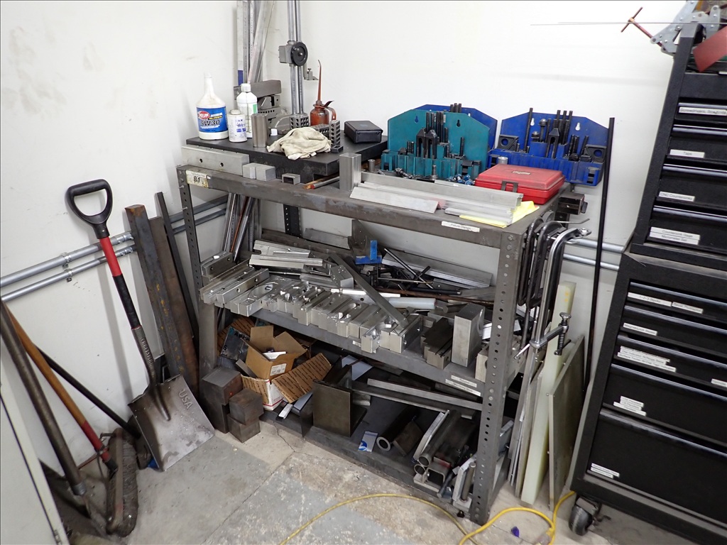 GROUP OF GRINDER, LADDER, TOOLING, SHARPENER, HOLD DOWNS, CARTS, TOOLING & MISC.
