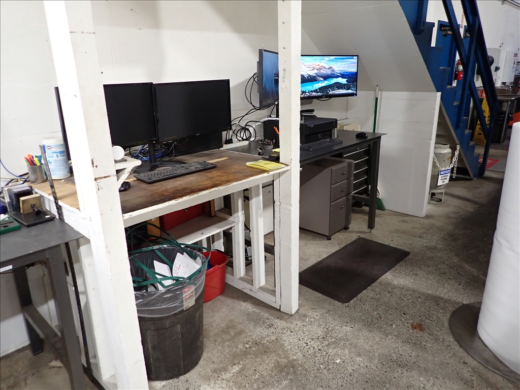 GROUP OF PALLET JACK, CARTS, BANDING CART, BENCHES & MISC. SUPPLIES