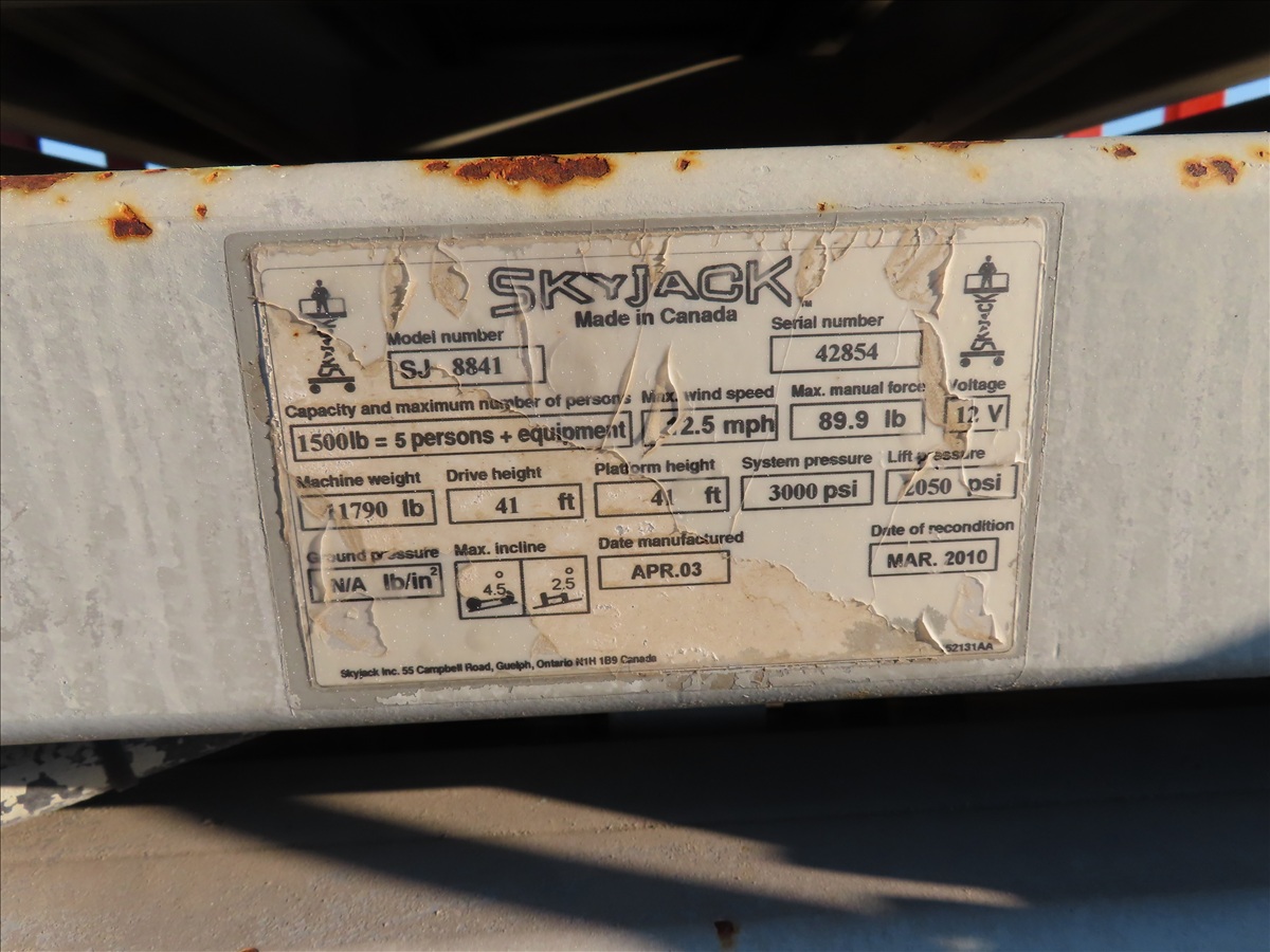 SCISSOR LIFT, 41' PLATFORM HEIGHT, 1,500 LB CAP, HOUR METER READS: 2,113 (NO CONTROLS, (2) DEBEADED TIRES, NEEDS REPAIR)