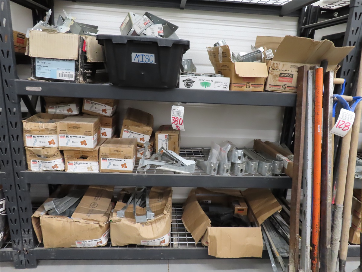 LOT, ASSORTED SIMPSON STRONGTIE HARDWARE ON THIS SHELF W/SHELF
